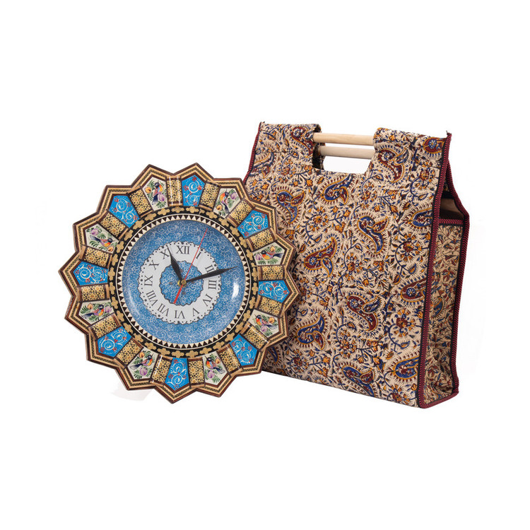 این ساعت درون یک ساک پارچهای قلمکار با ابعاد ۴۰×۳۵×۱۰ سانتیمتر قرار گرفته است؛ بستهبندیای که علاوه بر زیبایی و دوام، حس ایرانی و فرهنگی این هدیه را دوچندان میکند.