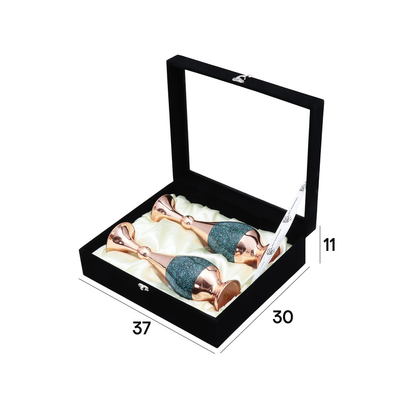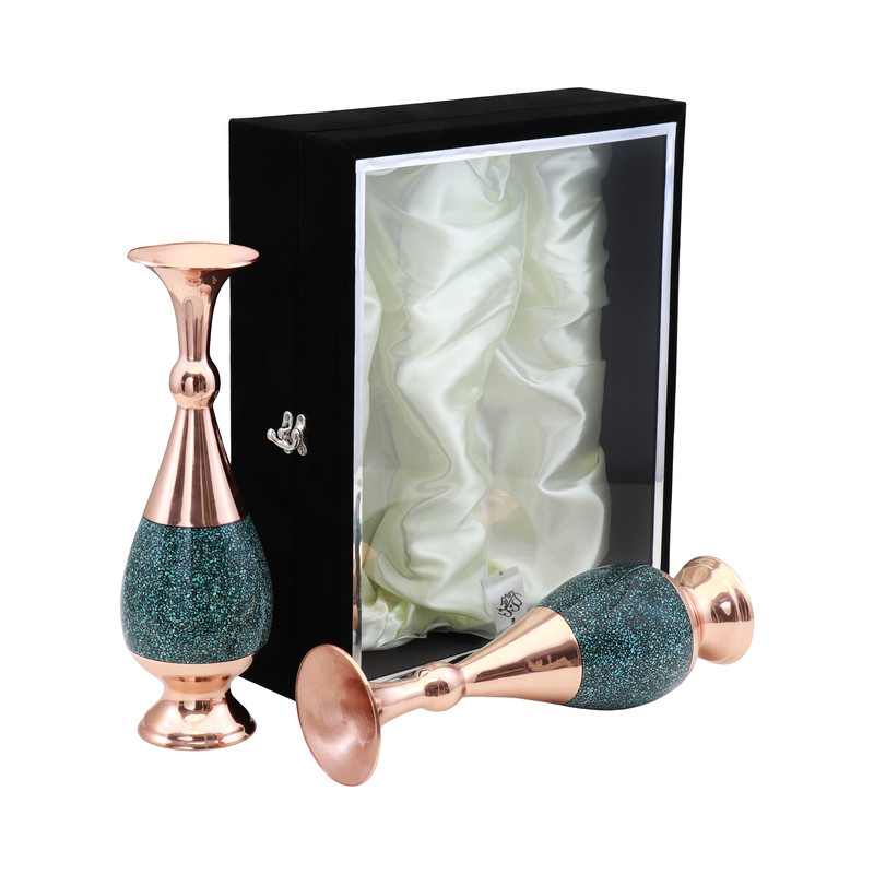 پک هدیه چنار ۱۷ شامل یک جفت گلدان فیروزهکوبی سایز ۳۰ است که در جعبهای شکیل از جنس جیر با درب شیشهای و ابعاد ۳۷×۳۰×۱۱ سانتیمتر قرار گرفته است. در این گلدانها، قطعات ریز و درخشان سنگ فیروزه با دقت و مهارت بر روی بدنه فلزی کار شده و جلوهای خاص، لوکس و بسیار چشمنواز ایجاد کردهاند. این ترکیب هنری، پک هدیه چنار ۱۷ را به گزینهای ممتاز برای هدایای رسمی و ارزشمند تبدیل کرده است. شرایط نگهداری: