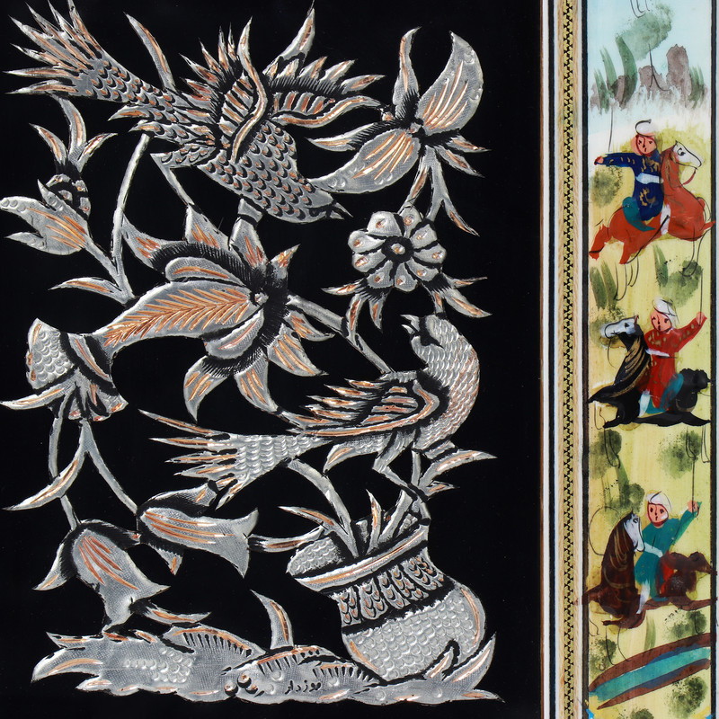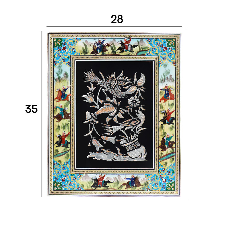 این تابلوی دیواری با ابعاد درونی ۱۸ در ۲۴ و ابعاد بیرونی ۲۸ در ۳۵ سانتیمتر، اثری است که هنر را در لایههای مختلف به نمایش میگذارد. برخلاف قابهای معمولی، در این محصول «قاب» خود بخشی از اثر هنری است. در مرکز تابلو، پلاک مسی ارزشمندی قرار گرفته که با لعاب قلع سفیدکاری شده و با سیاهقلمکاری، عمق یافته است. اما ویژگی متمایز این محصول، حاشیه یا همان قاب دور آن است که با نقاشیهای دستی ظریف و رنگارنگ (معمولاً طرحهای شکارگاه یا گل و بوته) مزین شده و جلوهای گرم و سنتی به فلز سرد میانی بخشیده است. شرایط نگهداری