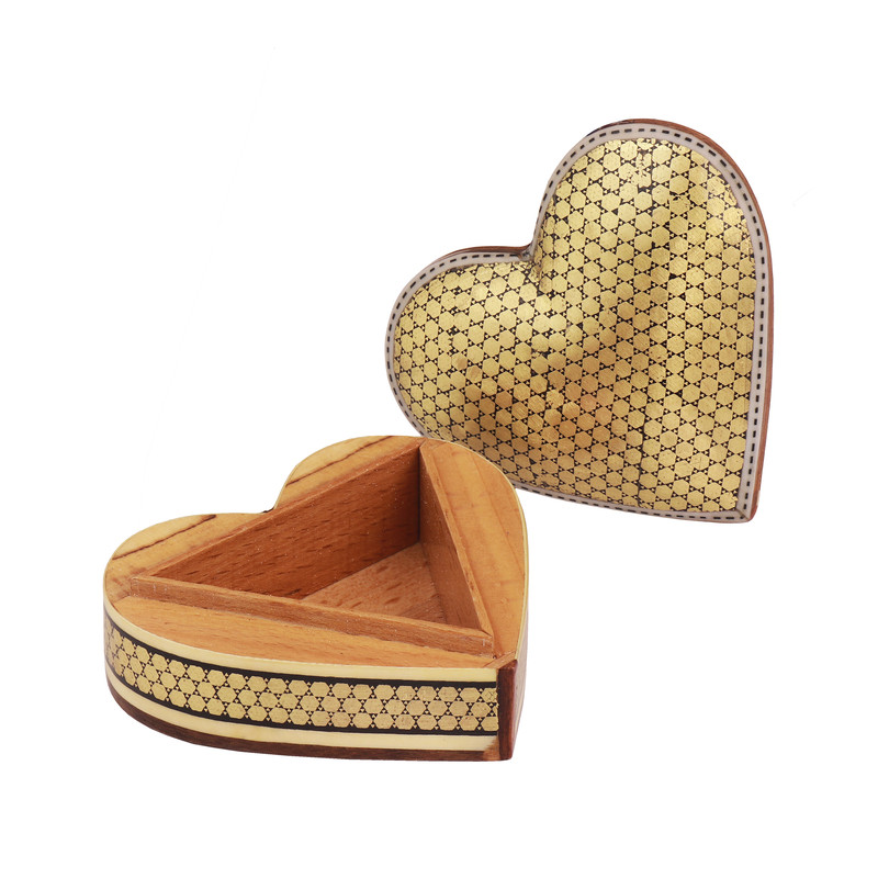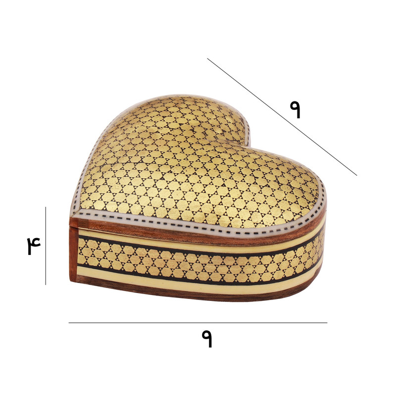 مشخصات فیزیکی: جعبه سکهای با طراحی قلبی شکل و ابعاد ۹×۹×۴ سانتیمتر، از چوب باکیفیت ساخته شده و سطح خارجی آن با طرح خاتمکاری ظریف تزئین شده است. فضای داخلی جعبه از چوب راش ساخته شده که بهخوبی از محتوای داخل محافظت میکند.