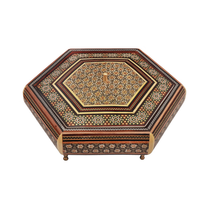 شیرینیخوری با طراحی ششضلعی، ترکیبی است از ظرافت خاتمکاری روی چوب، که زیبایی چشمگیری به میز پذیرایی میبخشد. سفرهی قلمکار نیز با چاپ دستی و رنگبندی سنتی، این ترکیب هنری را کامل میکند.