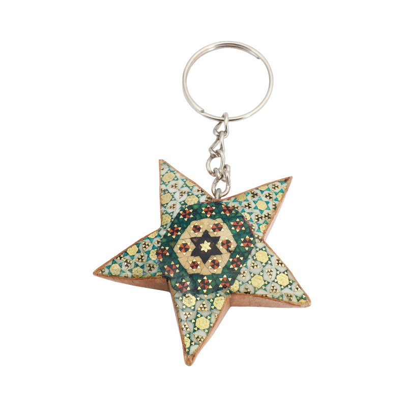 مشخصات فیزیکی: این سرکلیدی با فرم ستاره و ابعاد ۵×۵ سانتیمتر طراحی شده است. بدنهی چوبی آن با طرحهای ظریف خاتمکاری پوشیده شده که چشمنواز و منحصربهفرد است. حلقهی فلزی آن، اتصال ایمن به کلید، کیف یا کوله را فراهم میکند.پوشش چهار لایه ای از پلی استر روی تمام سطوح کار دوام و ماندگاری را تضمین میکند.