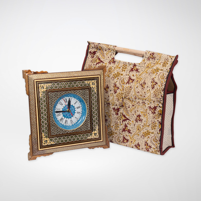 ساعت درون یک ساک دستی از پارچهی قلمکار قرار دارد که با ابعاد ۴۰×۳۵×۱۰ سانتیمتر ارائه میشود. این بستهبندی سنتی علاوه بر زیبایی، حس اصالت و هویت ایرانی را به هدیه میافزاید و نیازی به بستهبندی مجدد ندارد.