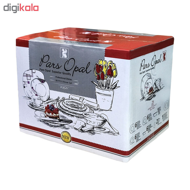 ظروف پارس اپال با زیبایی کلاسیک و طراحی موزون خود، از گذشته دارای بهترین وضعیت بوده و در اولین نگاه نظر هر بینندهای را جلب مینماید. «سرویس غذاخوری 28 پارچه پارس اپال» با طراحی زیبا برای شش نفر مناسب خواهد بود. سرویس غذاخوری ، یکدست بشقاب غذاخوری با قطر 27 سانتیمتر، یکدست خورشخوری با قطر 23 سانتیمتر، یکدست پیشدستی با قطر 15 سانتیمتر، یکدست ماستخوری با قطر 15 سانتیمتر و دو عدد نمکپاش با قطر 4/5 سانتیمتر دارد. همچنین در کنار این ظروف یککاسهی بزرگ سالاد با قطر 23/8 سانتیمتر و یک عدد دیس مستطیل با قطر 28 سانتیمتر هم دارید. ظروف اوپال نسبت به چینی در مقابل ضربه مقاومترند و از دیگر ویژگیهای آنها قابلیت استفاده در ماکروویو و شستوشو با ماشین ظرفشویی است.