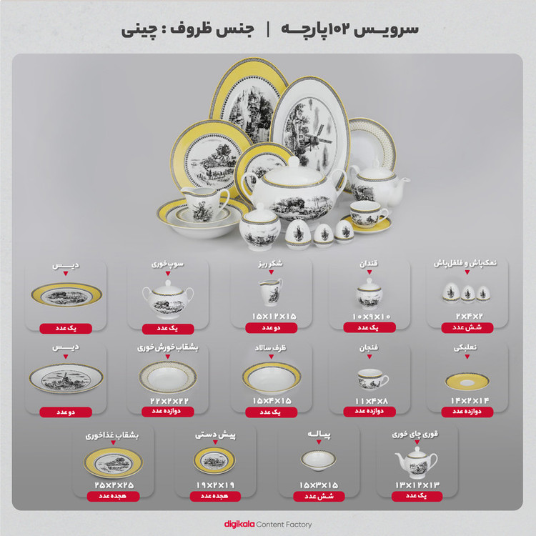 سوپخوری , ظرف سالاد , سالادخوری , دیس , بشقاب غذاخوری , بشقاب خورشخوری , پیشدستی , قوری چایخوری , فنجان , نعلبکی , قندان , شکرریز , نمکپاش و فلفلپاش , پیاله , ظرف سس