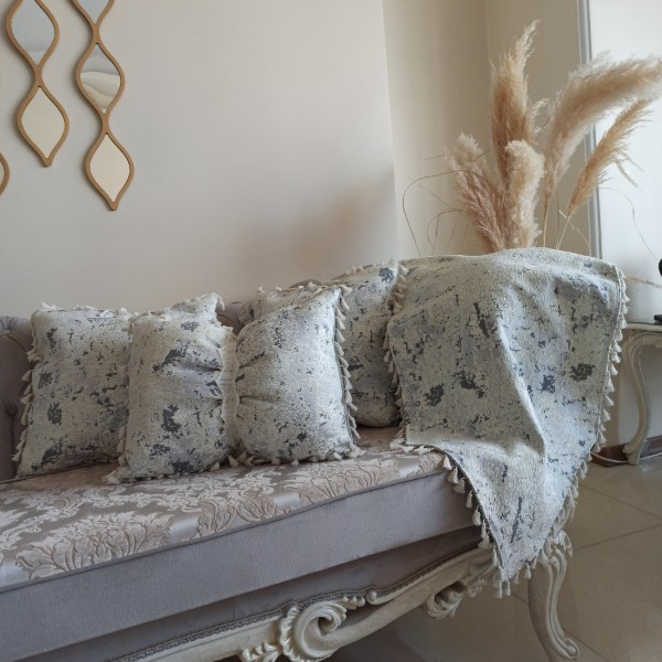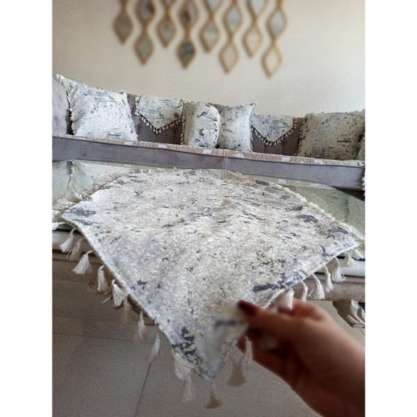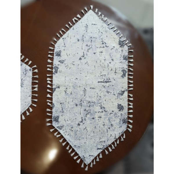 رانر چهار تکه ابعاد رانر میز غذاخوری 141x47 میز پذیرایی 76x40 و ابعاد دو عدد کوچک تر40x27 چنس شانل رنگ زمینه طوسی روشن خیلی شیک و خوش نقش برای میز ناهار خوری و میز تلویزیون و میز عسلی و....