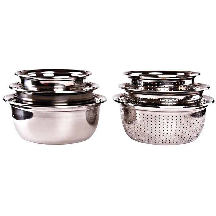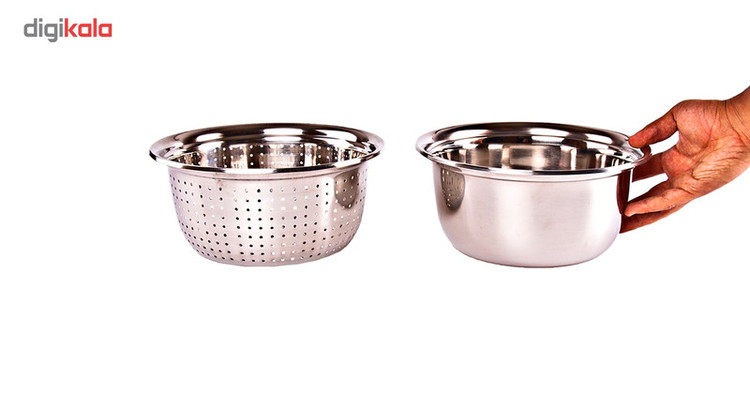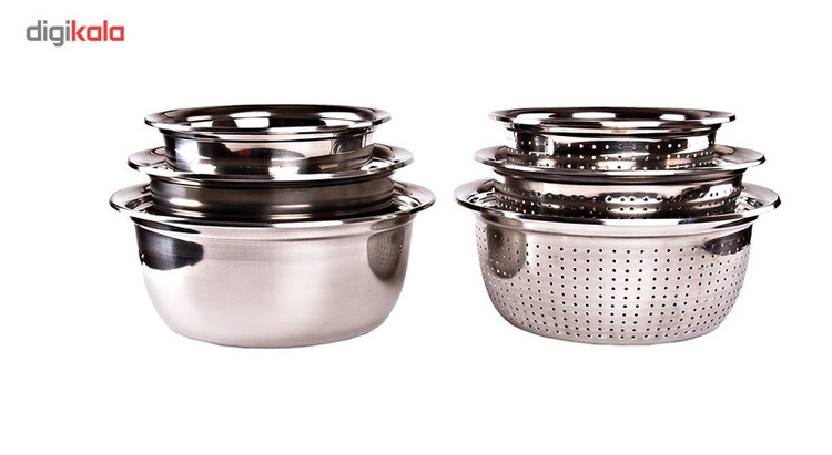 - ست 6 پارچه آبکش و کاسه استیل - جنس بدنه استیل ضد زنگ - شامل 3 عدد کاسه به سایزهای: 24، 28، 32 سانتیمتر - 3 عدد آبکش به سایزهای: 24، 28، 32 سانتیمتر - امکان قرار گیری آبکش و کاسه داخل یکدیگر