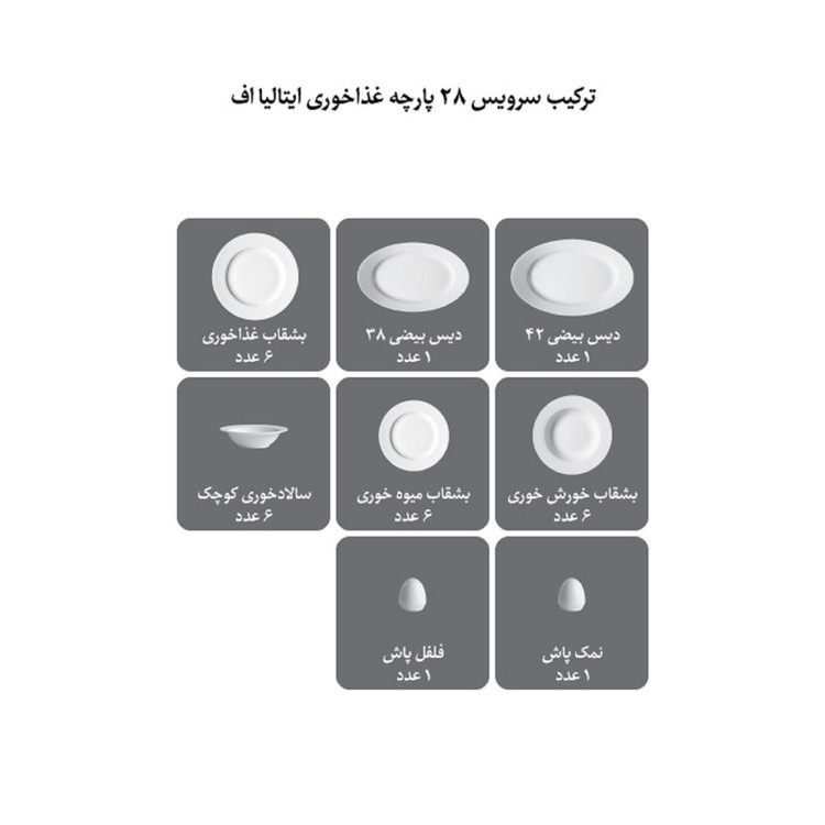 دیس , بشقاب غذاخوری , بشقاب خورشخوری , پیشدستی , نمکپاش و فلفلپاش , پیاله