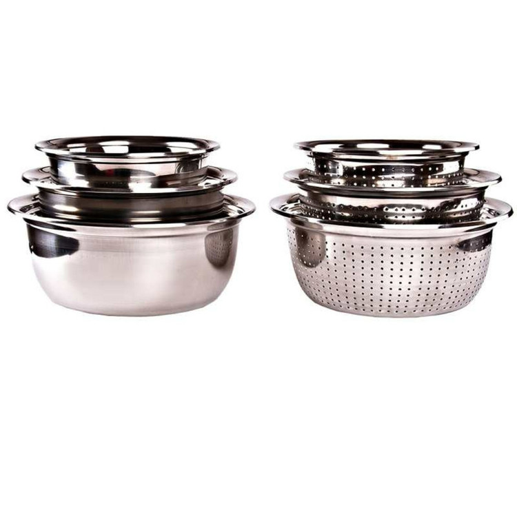 - ست 6 پارچه آبکش و کاسه استیل می باشد . - جنس بدنه استیل ضد زنگ می باشد . - شامل 3 عدد کاسه به سایزهای: 22، 30، 36 سانتیمتر می باشد . - 3 عدد آبکش به سایزهای: 22، 30، 36 سانتیمتر می باشد . - امکان قرار گیری آبکش و کاسه داخل یکدیگر می باشد .