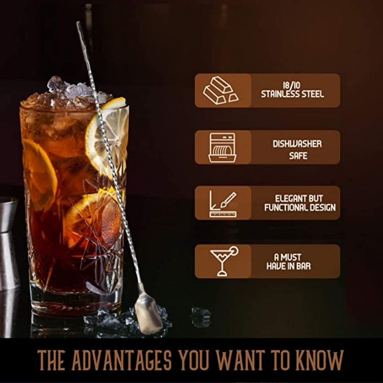 از مزایای ان نسبت به موارد مشابه خود میشود گفت ضد زنگ است ،ضخیم تر است ،قسمت پائین ان (پاروئی ) با اتصال محکم تری نسب شده و جدا نمیشود و قطر نی ان بسیار مناسب است و همچنین ارتفاع کلی قاشق متناسب لیوان ها شربت خوری با کیفیت است .