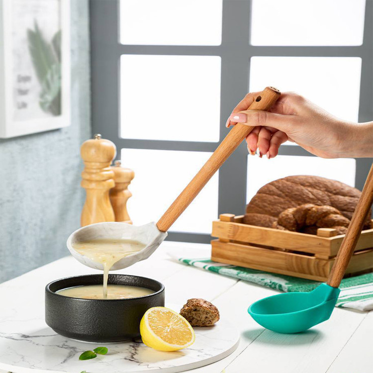 ملاقه سیلیکونی دسته چوب راش دسته گرد جنس سیلیکون درجه 1 بدون تغییر رنگ بر اثر حرارت