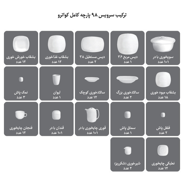 سوپخوری , ظرف سالاد , دیس , بشقاب غذاخوری , بشقاب خورشخوری , پیشدستی , قوری چایخوری , فنجان , نعلبکی , قندان , شکرریز , نمکپاش و فلفلپاش , لیوان