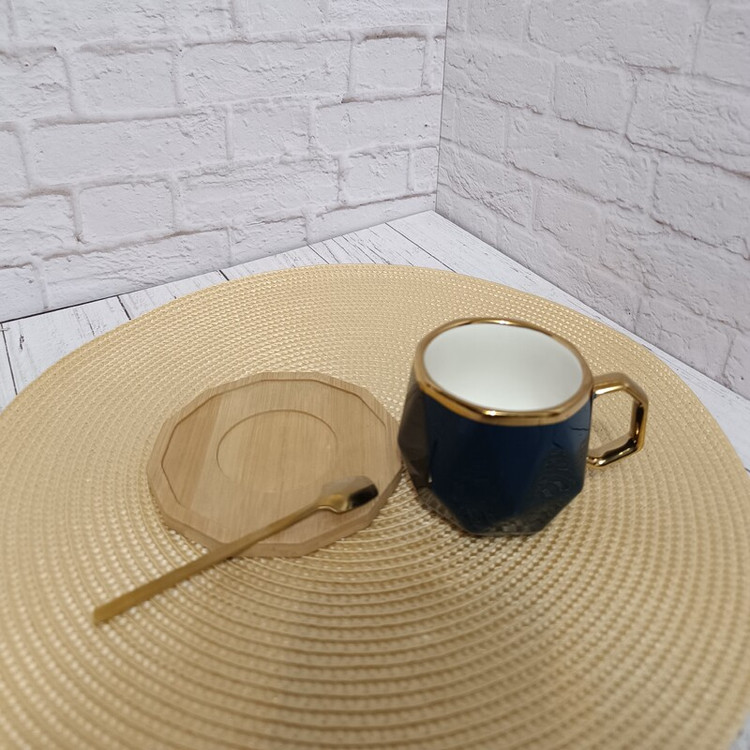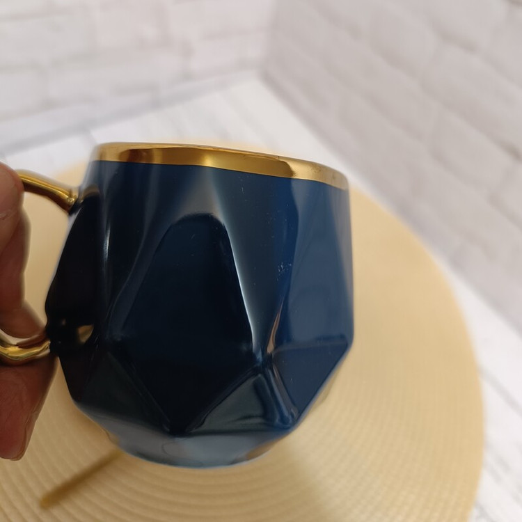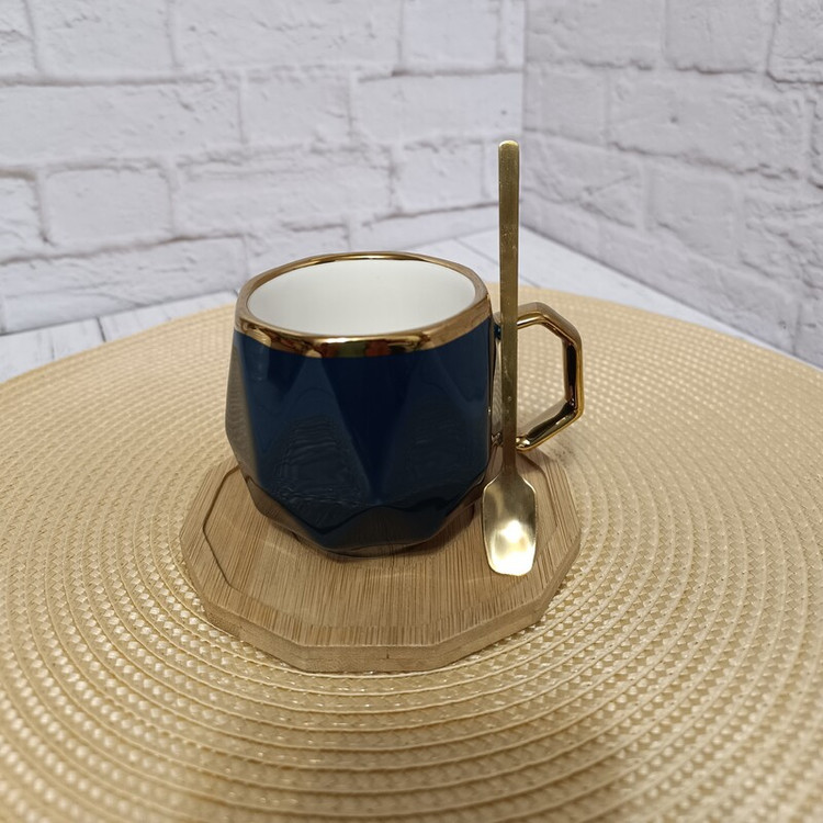 ماگ سرامیکی وارداتی طرح لوزی رنگ سرمه ای با دسته طلایی و زیره بامبو با قاشق