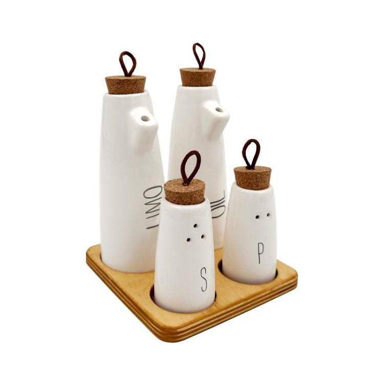 شامل نمک پاش و فلفل پاش و روغن ریز و آبلیمو خوری که بر روی یک استند چوبی قرار میگیرد.