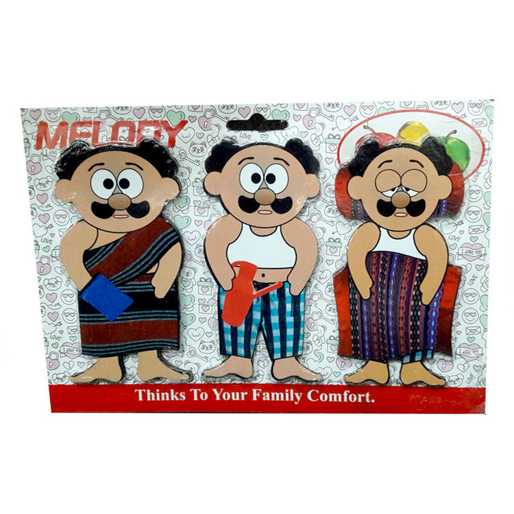 دارای 3 عروسک چوبی در طرحهای مختلف دارای یک تکه چسب دو طرفه در پشت هر عروسک برای نصب روی درب