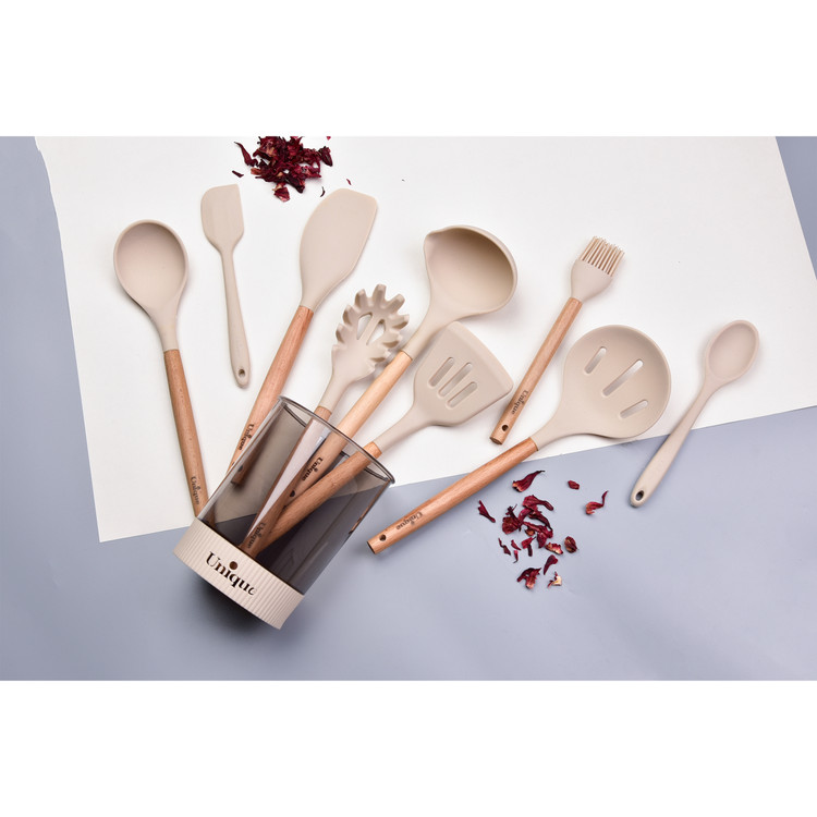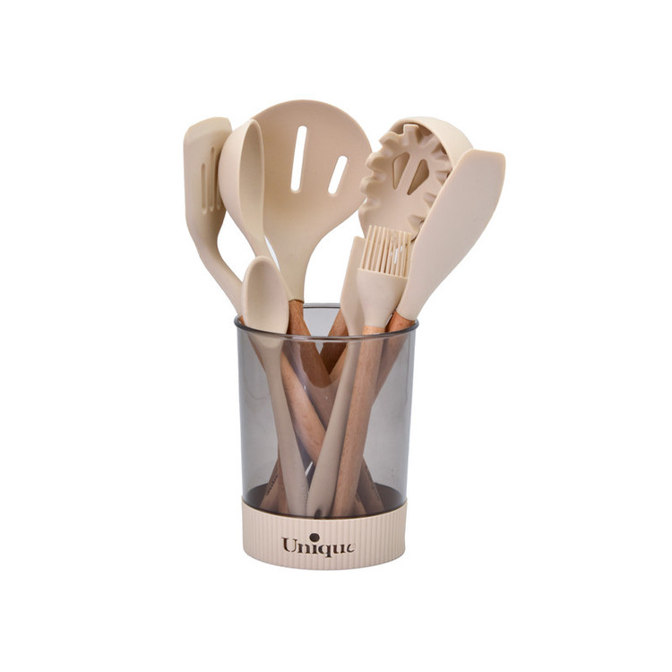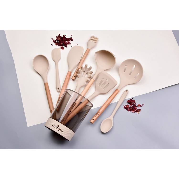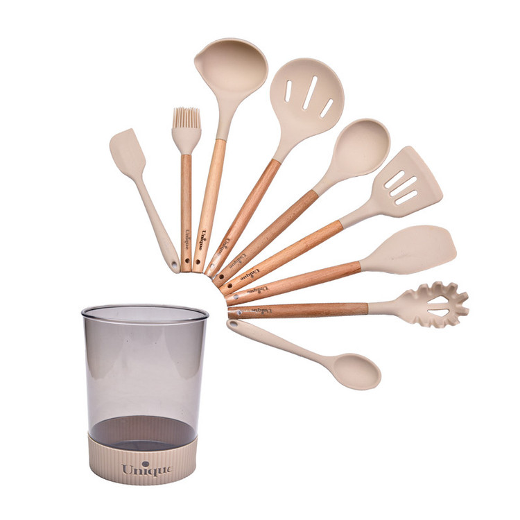 سرویس کفگیر و ملاقه یکی از پرکاربرد ترین لوازم و ابزارهای آشپزخانه است که در هر آشپزخانه در کنار اجاق گاز حتما آن را پیدا خواهید کرد . ست کفگیر و ملاقه در جنس ها و ابزارهای مختلفی در بازار وجود دارند که باتوجه به نیازتان میتوانید آنها را تهیه کنید. سرویس 10 پارچه کفگیر و ملاقه سیلیکونی دسته چوبی یونیک از سیلیکون ساخته شده است. که با داشتن طراحی زیبا و منحصربه فرد، علاوه بر کاربردی بودن، میتواند زینت بخش فضای آشپزخانه تان باشد.