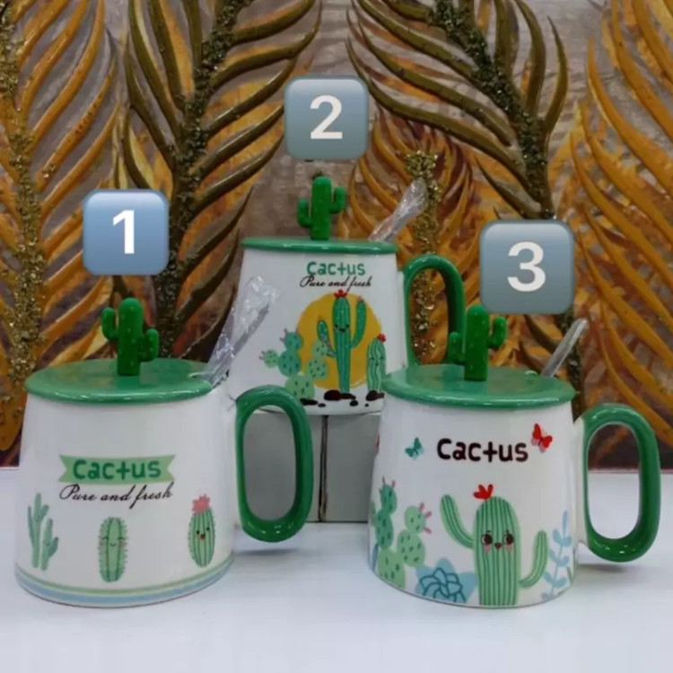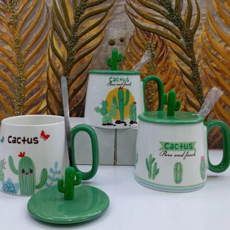 ماگ کاکتوس سرامیکی دربدار و قاشقدار وارداتی