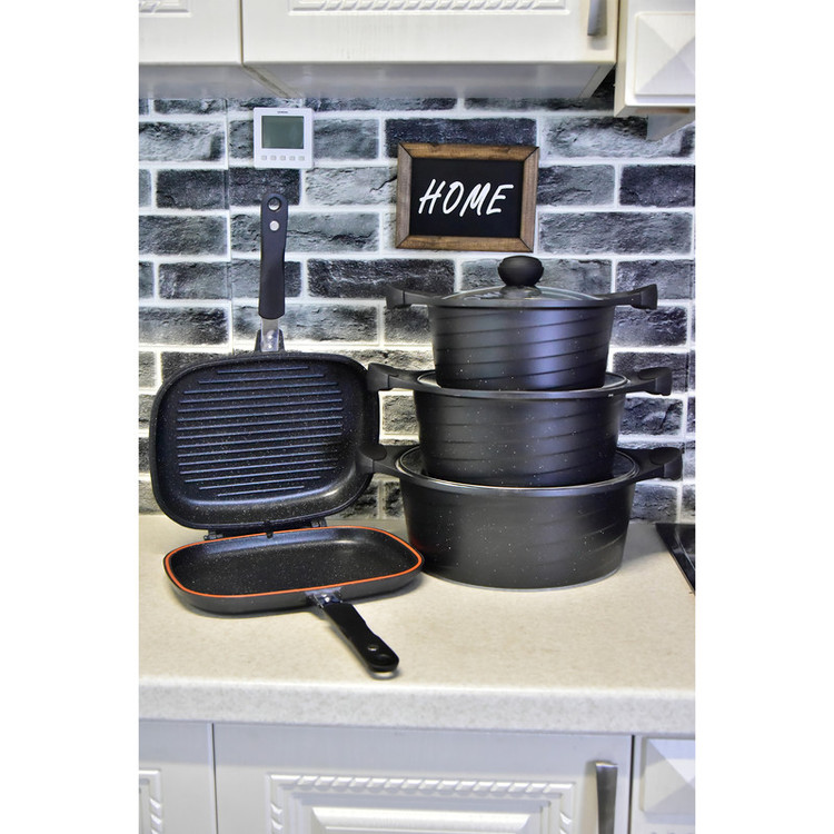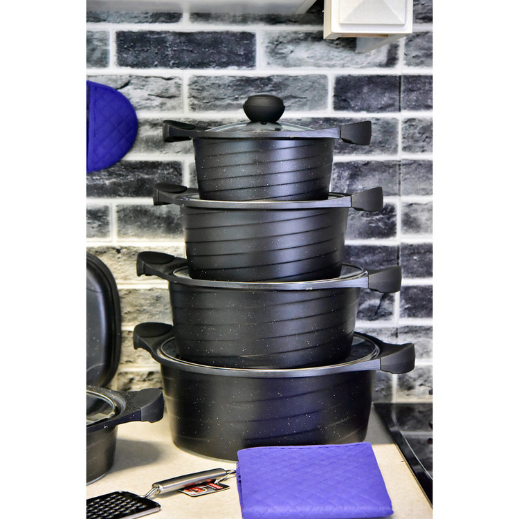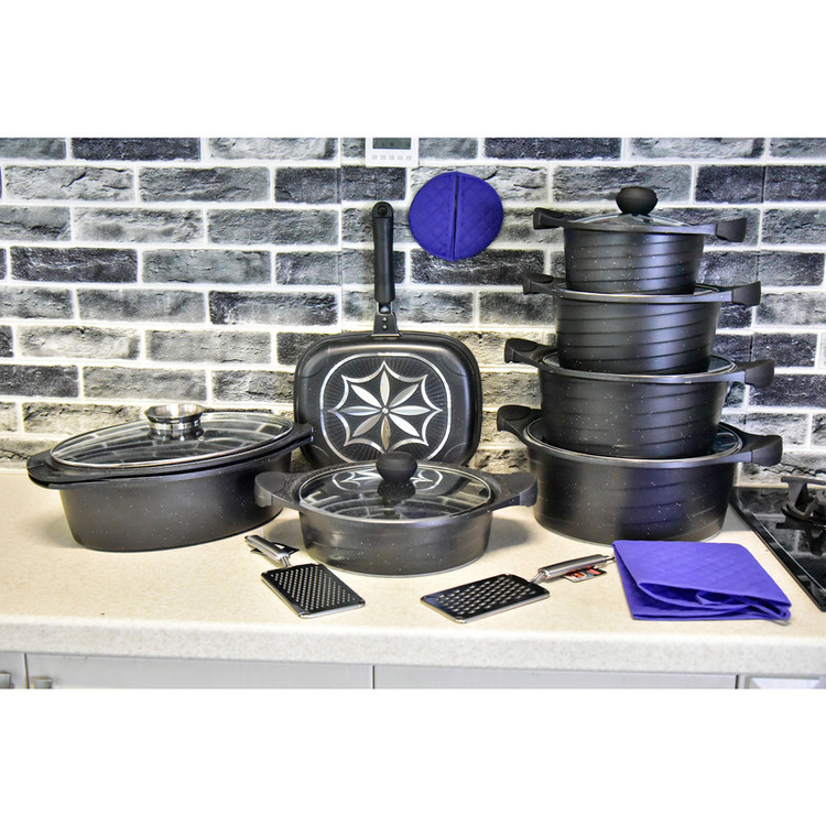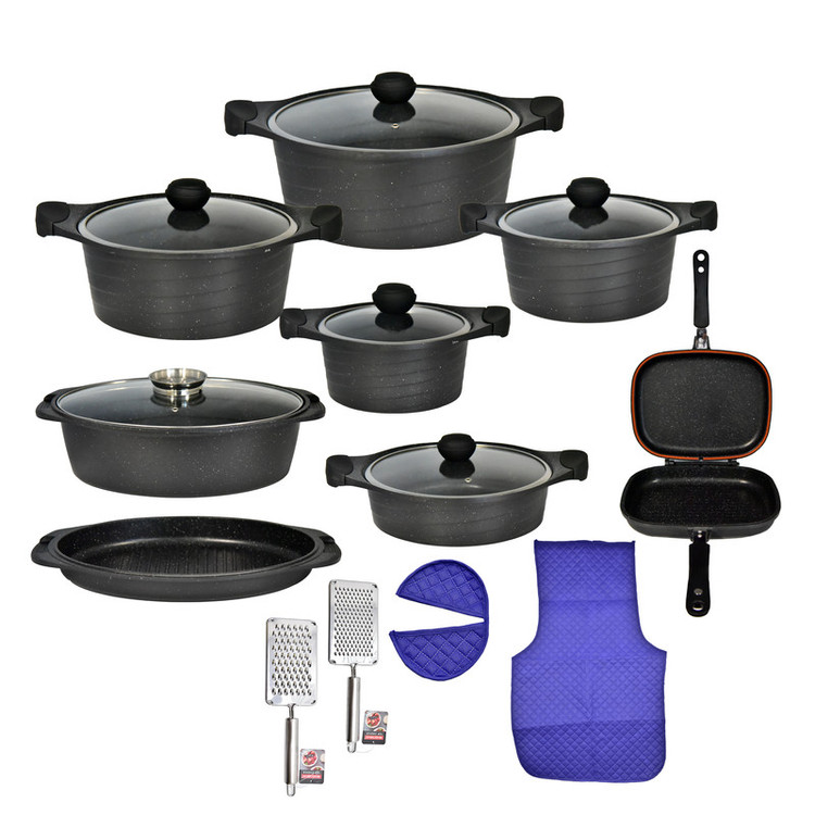 این سرویس شامل: 4 عدد قابلمه 1 عدد تابه دو دسته 1 عدد تابه دوطرفه 1 عدد تابه گریل سه پارچه 2 عدد رنده و یک پیشبند و دو عدد دستگیره میباشد