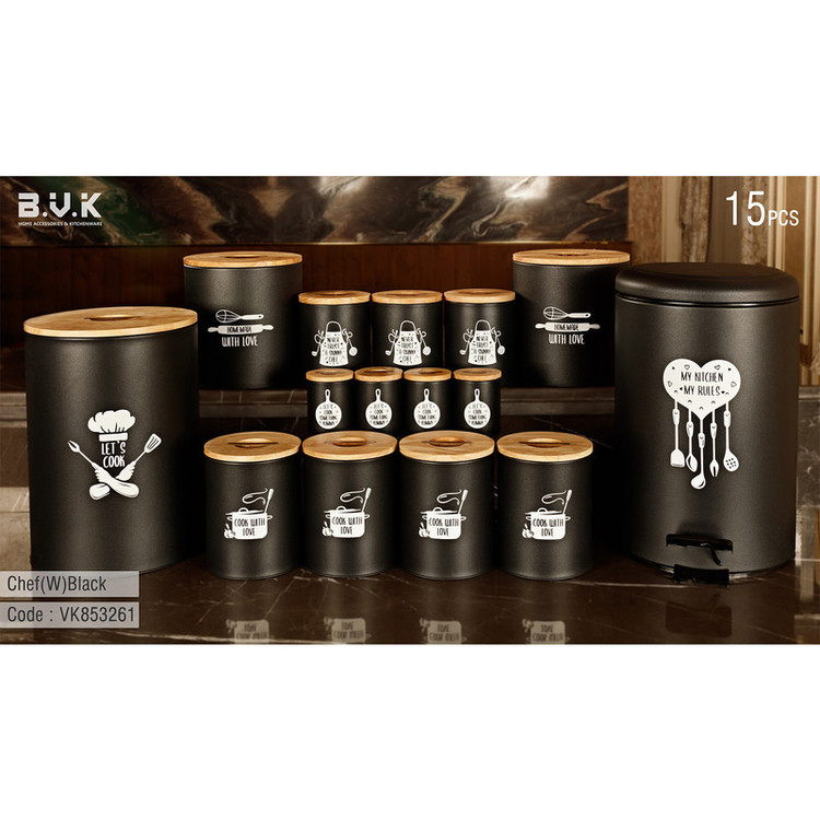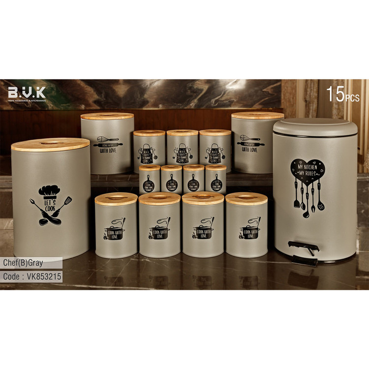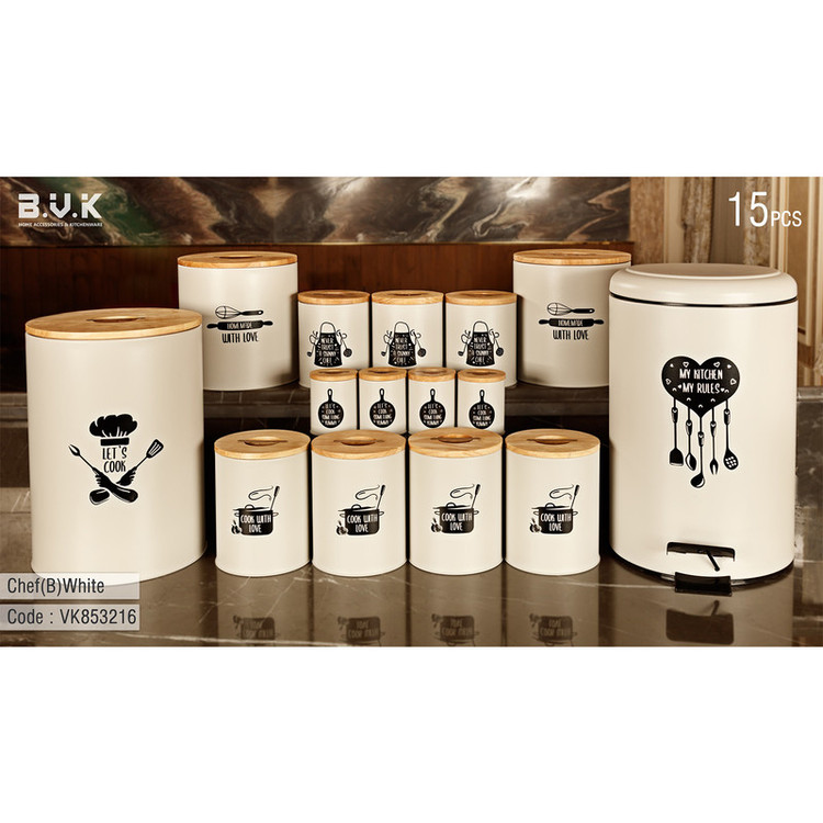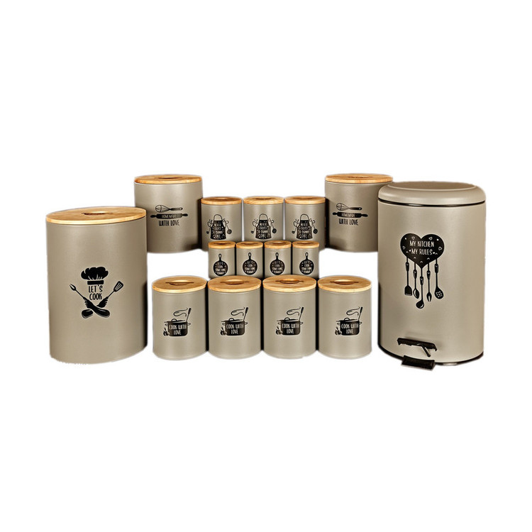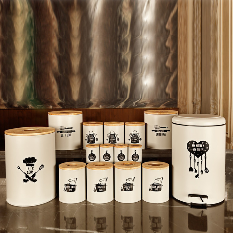 این سرویس شامل: سطل زباله 1عدد جای شکر 1عدد جای قند 1عدد سطل برنج 1عدد ظرف حبوبات 4عدد پاسماوری 3عدد ظرف ادویه 4عدد