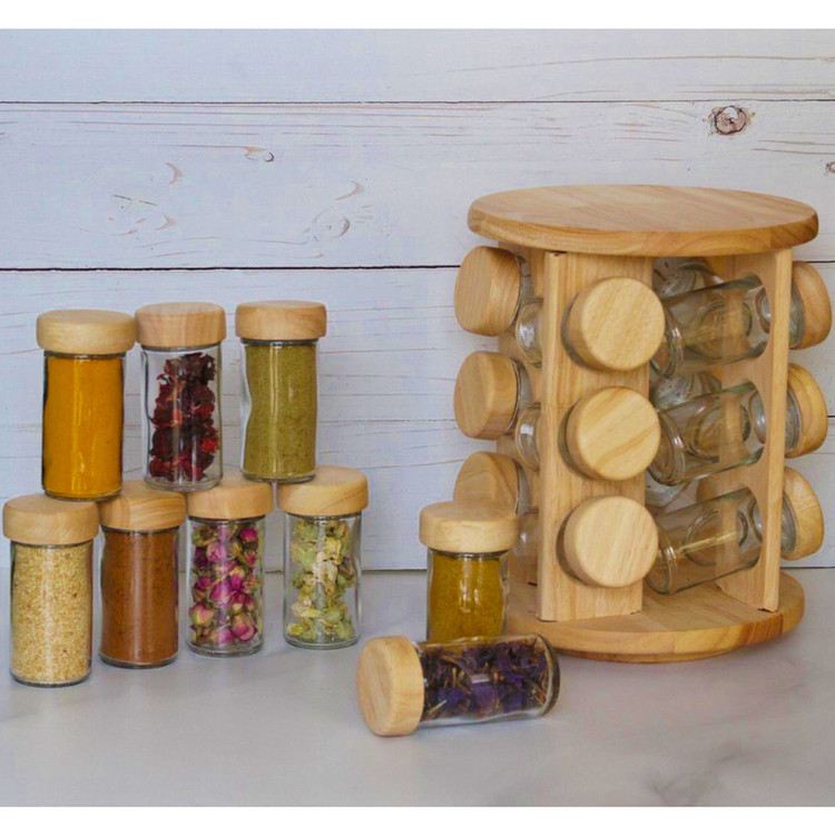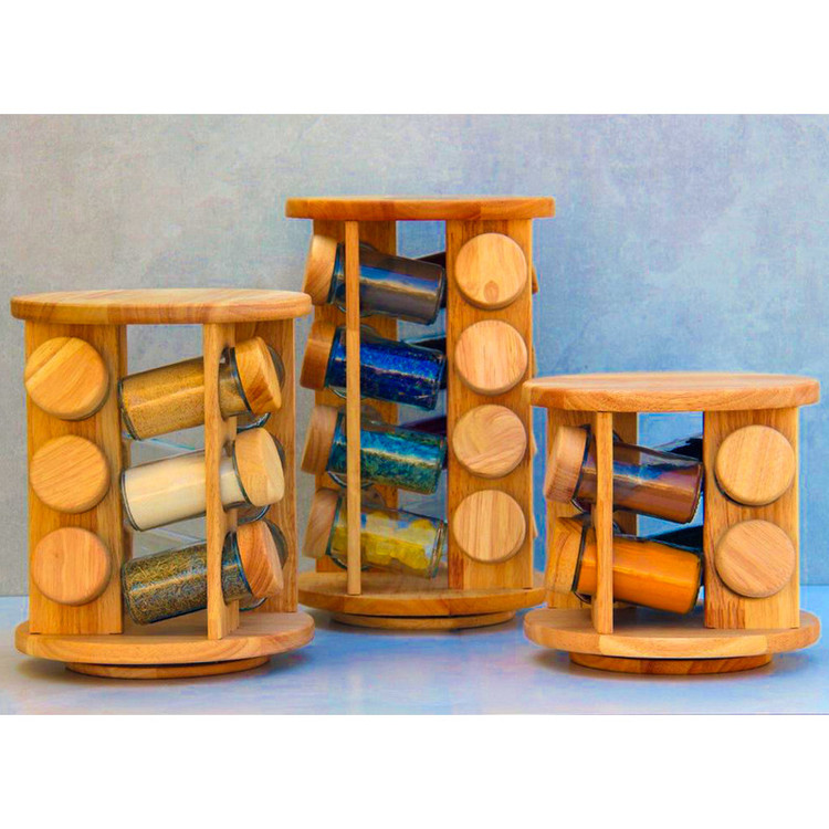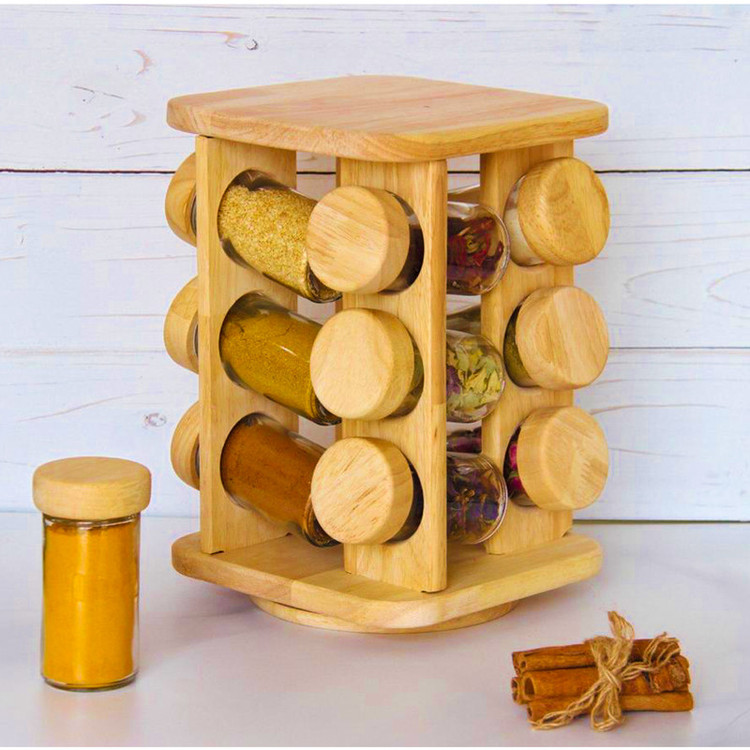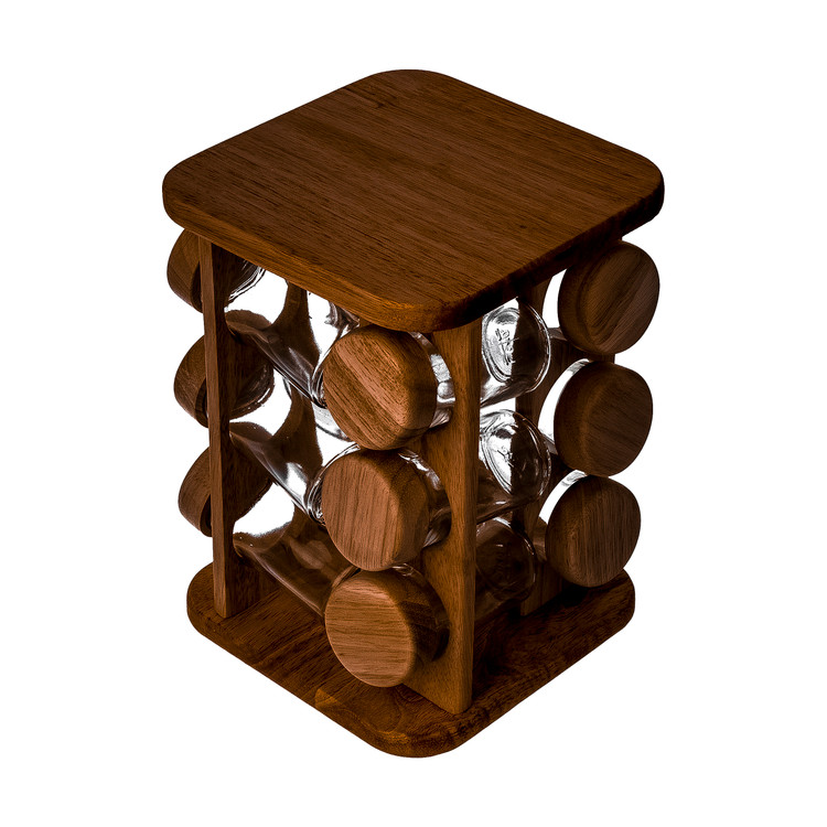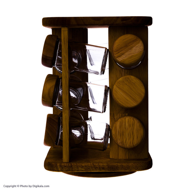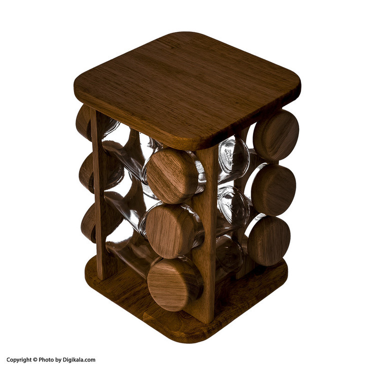 ساخته شده از چوب اکازیا ( اقاقیا ) دارای نقش و خلل و فرج طبیعی شامل 12 جا ادویه شیشه ای با درب چوبی هر یک به قطر 4 و ارتفاع 10 سانتیمر با خروجی ثابت قابلیت چرخش 360 درجه استند نگهدارنده به هر دو طرف شیک و ساده دارای جعبه ساخت کشور ایران