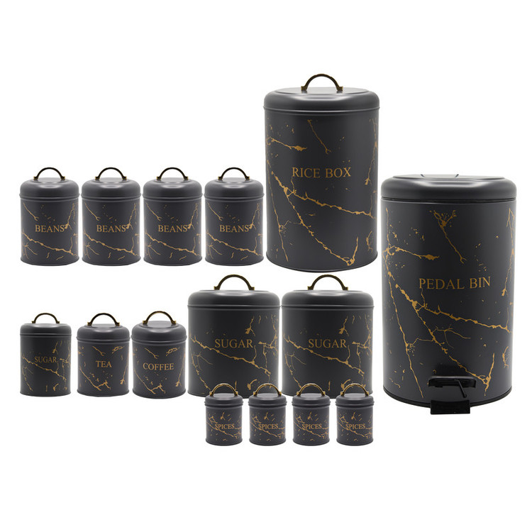 این سرویس شامل یک عدد سطل زباله یک عدد سطل برنج چهار عدد ظرف حبوبات دو عدد ظرف قند و شکر سه عدد پاسماوری چهار عدد ظرف ادویه میباشد فلز ضد زنگ رنگ ثابت بسیار بادوام و با کیفیت جنس رنگ استاتیک کوره ای