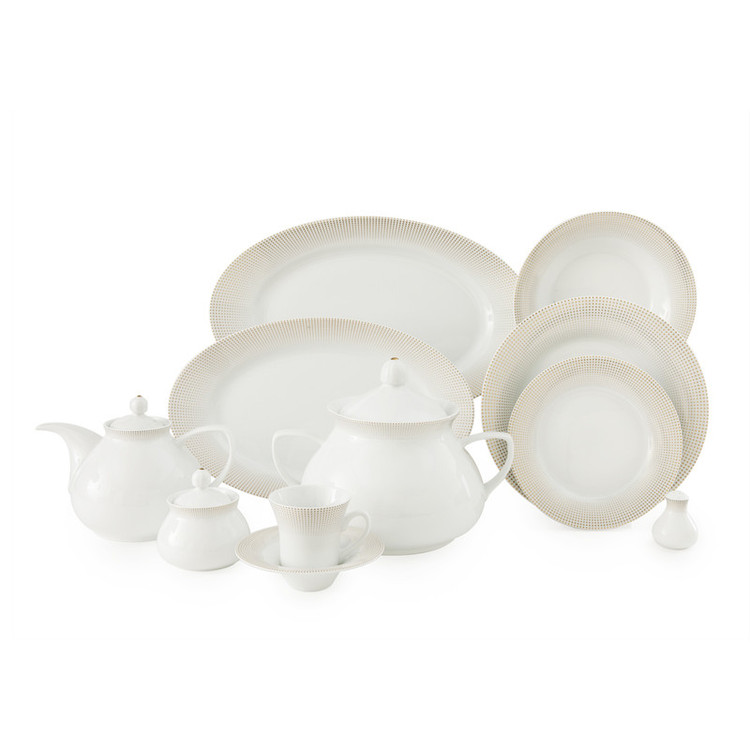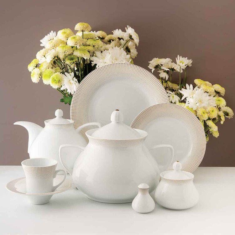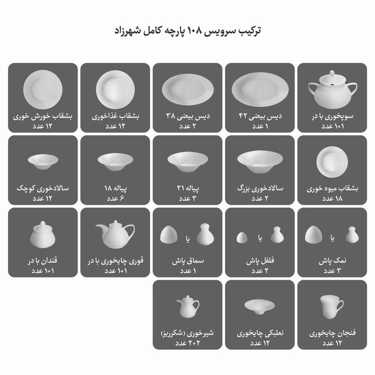 سوپخوری , ظرف سالاد , سالادخوری , دیس , بشقاب غذاخوری , بشقاب خورشخوری , پیشدستی , قوری چایخوری , فنجان , نعلبکی , قندان , شکرریز , نمکپاش و فلفلپاش , پیاله