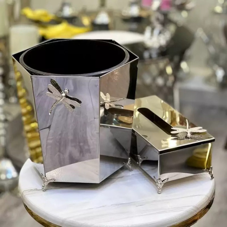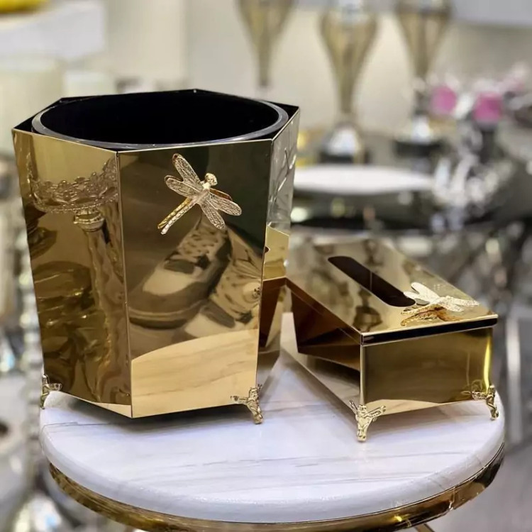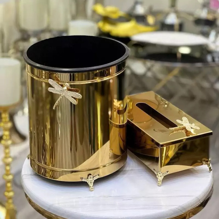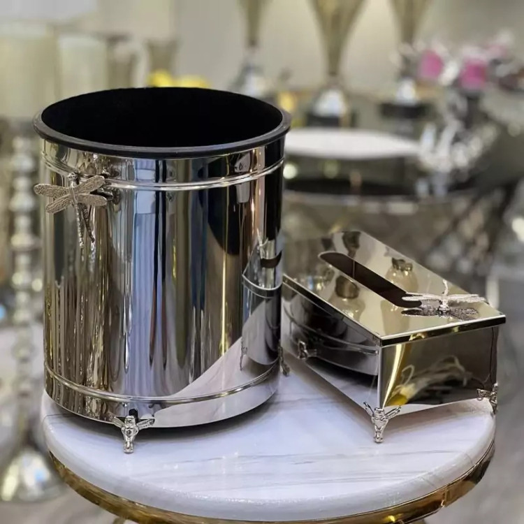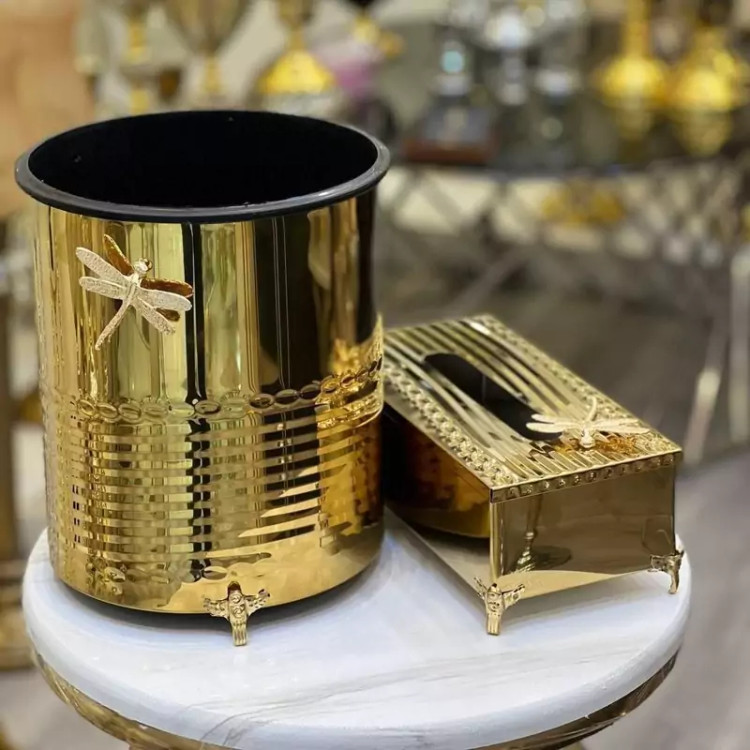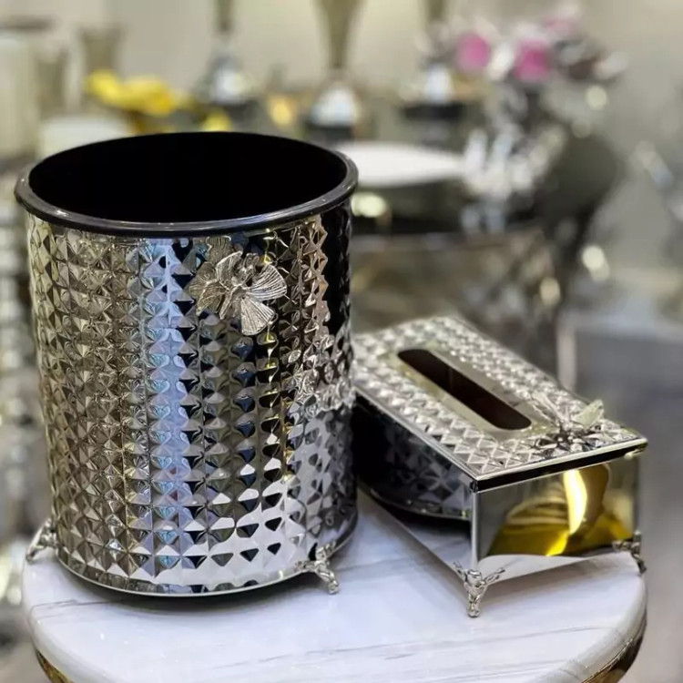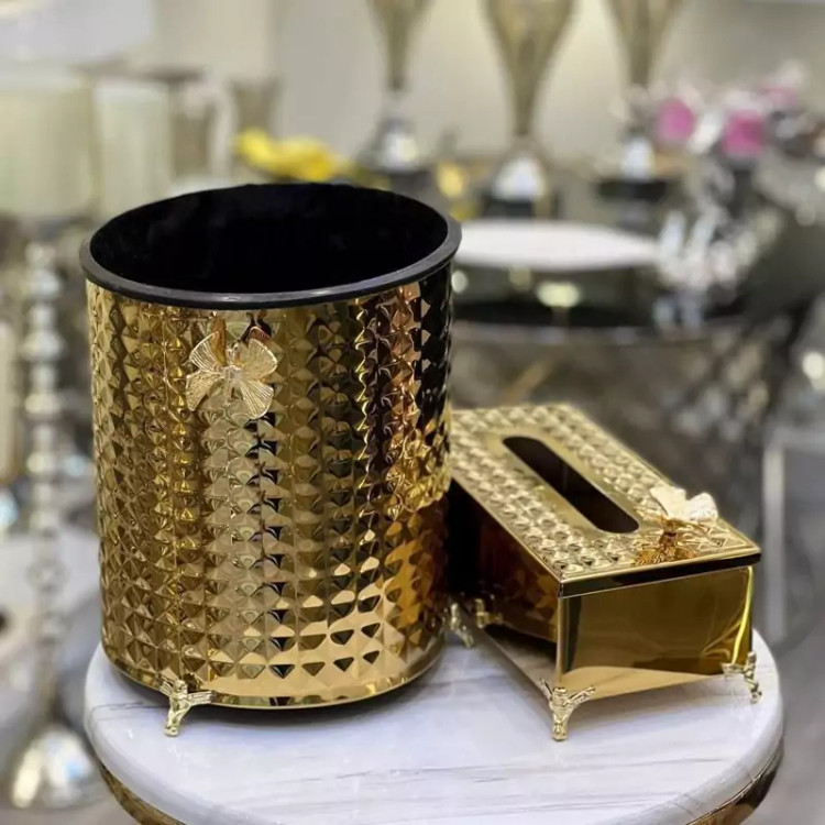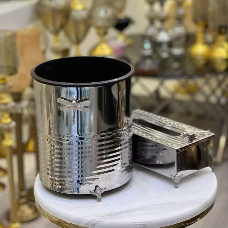 سطل دستمال فلزی آبکاری شده در دورنگ طلایی و نقره ای ساخت ایران با رویه استیکر برنجی