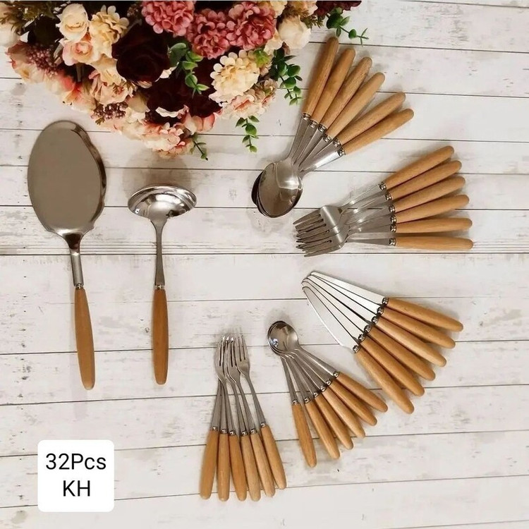 سرویس قاشق چنگال کارد ملاقه و کفگیر دسته چوبی 32 پارچه