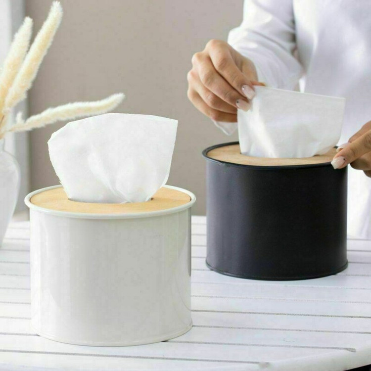 جا دستمالی گرد فلزی با درب چوبی در دو رنگ مشکی و سفید موجود است.