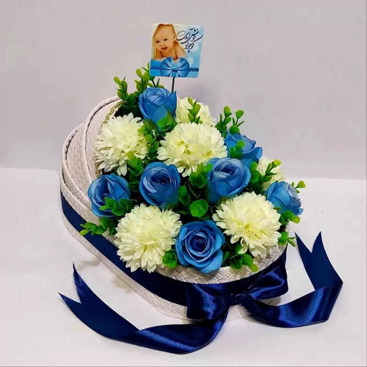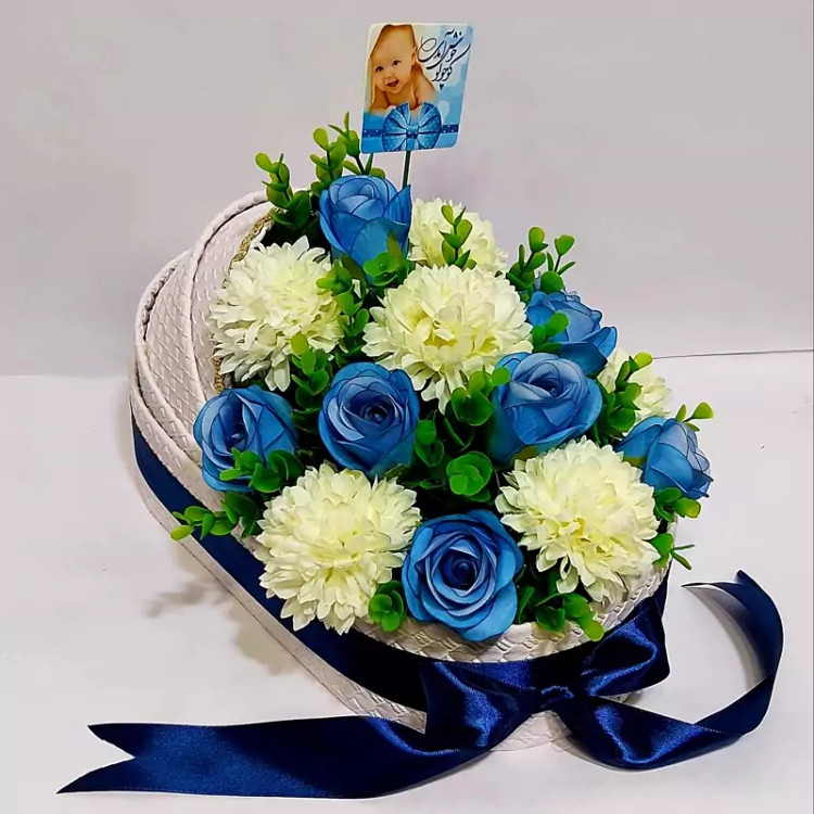 باکس گل مصنوعی گهواره ای نوزاد پسر کدt464 عالیجناب
