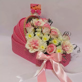 طراحی باکس گل به شکل گهواره نوزاد می باشد و می تواند جلوه ای از ورود فرشته های دوست داشتنی کوچک و پاک بر روی زمین باشد ،باکس گل گهواره صورتی به شکل زیبایی با گلهای رز پارچه ای لب ماتیکی ،شکوفه های سفید، داوودی صورتی ملایم (قابل شستشو) دیزاین شده جنس بدنه باکس گل گهواره چرمی بوده و براحتی تمیز می شود،برای استحکام بیشتر در قسمت زیرین باکس گل گهواره از چوب استفاده شده تا در زمان ارسال باکس گهواره هیچ آسیبی نبیند .