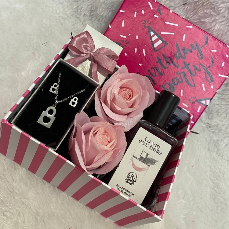 باکس هدیه دخترانه وزنانه،باکس کادو دخترانه صورتی،پک کادویی روز زن، نیم ست ادکلن و گل دخترانه مناسب تولد روز دختر ولنتاین