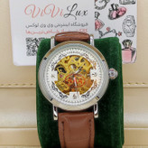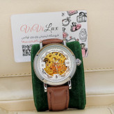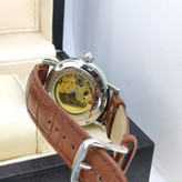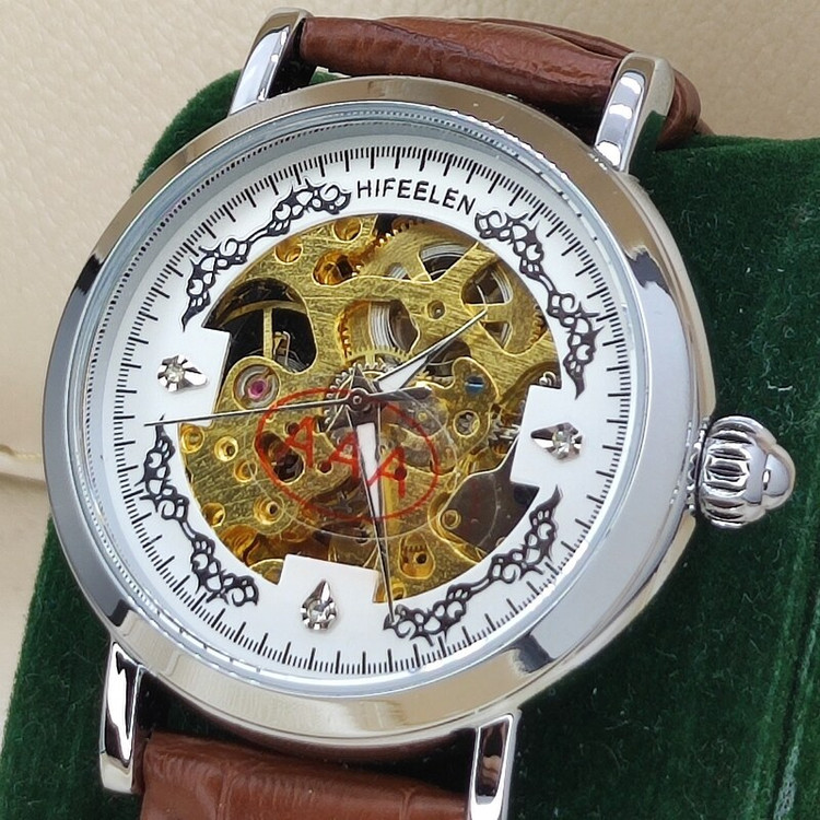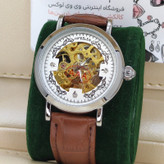 ساعت مچی اتوماتیک نبضی کوکی اورجینال هایفیلن HIFEELEN قلب باز موتور نمایان AAA  قاب نقره ای صفحه سفیدبند چرم قهوه ای