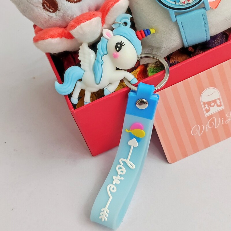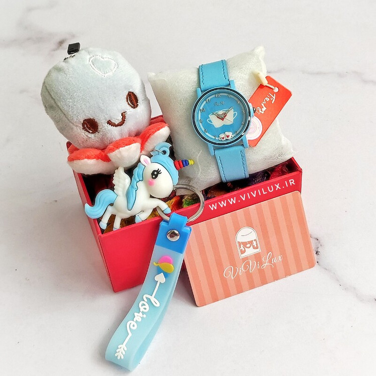پک کادویی زنانه آبی عاشقانه ساعت زنانه و اختاپوس و جاکلیدی و گلبرگ و باکس
