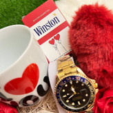 ست VIP هدیه مردانه با ساعت رولکس ساب مارین گرید بالا، ماگ سرامیکی لاو، شکلات، قلب پولیشی، گل و باکس لوکس دوستت دارم مناسب روز مرد و هدیه ولنتاین مردانه