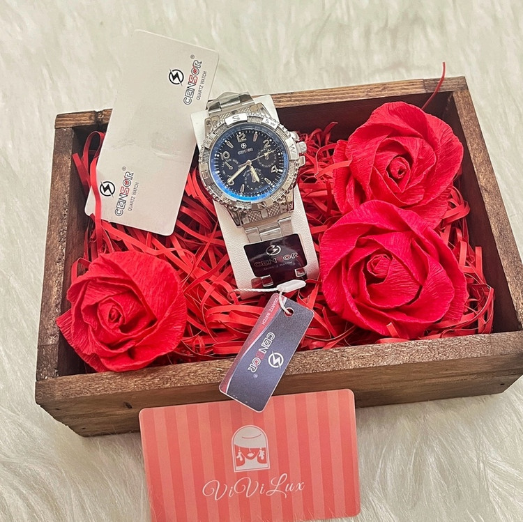 پک هدیه ولنتاین مردانه ساعت برند سنسور شیشه رفلکت با باکس چوبی و گل هدیه مردانه ولنتاین تولد پدر مرد