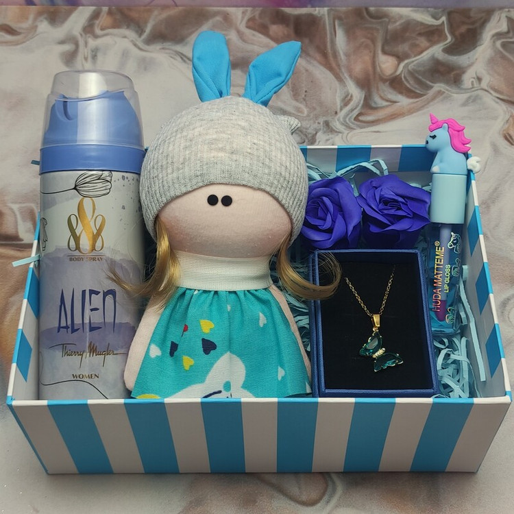 باکس هدیه زنانه و دخترانه آبی سفارشی کد5 پک هدیه