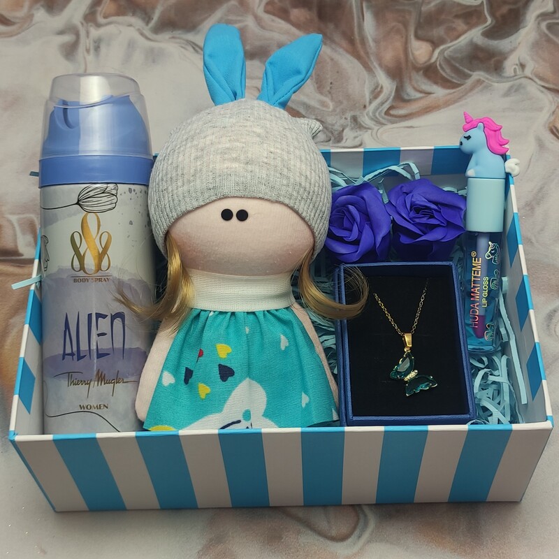 باکس هدیه زنانه و دخترانه آبی سفارشی کد5 پک هدیه