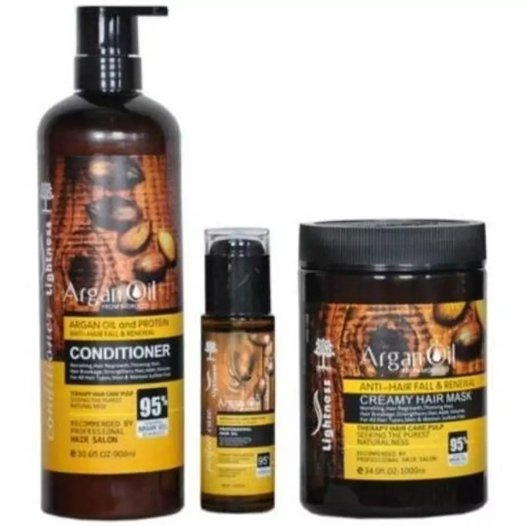 پک مراقبت مو آرگان لایتنس حاوی روغن آرگان برای محافظت از سلامت پوست و موی شماست که شامل ماسک مو، نرم کننده مو، سرم مو و شامپو مو آرگان میباشد. اگر موهای خشک و آسیب دیده ای دارید که در اثر رنگ کردن، دکلره و … طراوت و شادابی خود را از دست داده است .با استفاده از این پک مراقبت مو آرگان لایتنس میتوانید پس از هر بار استحمام، موهای خود را ترمیم و تقویت کنید.پک مراقبتی لایتنس مدل آرگان دارای شامپو بدون سولفات مدل آرگان در حجم 900 میلی لیتر و ماسک داخل حمام بدون سولفات در حجم 1000میلی لیتر به همراه روغن آرگان در حجم 100 میلی لیتر می باشد .