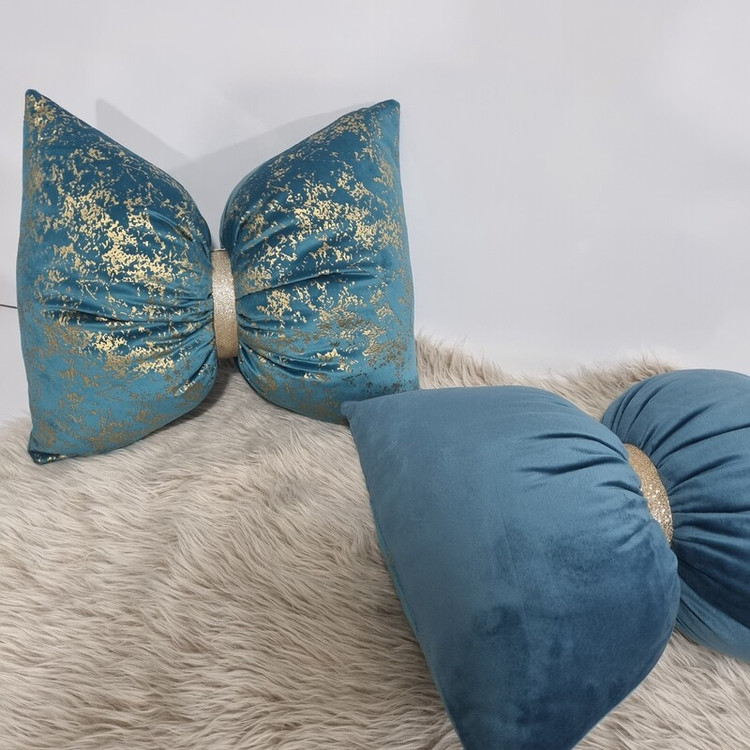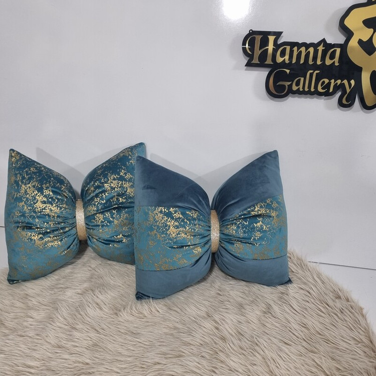 کوسن پاپیون با مخمل طلاکوب آبی فیروزه ای