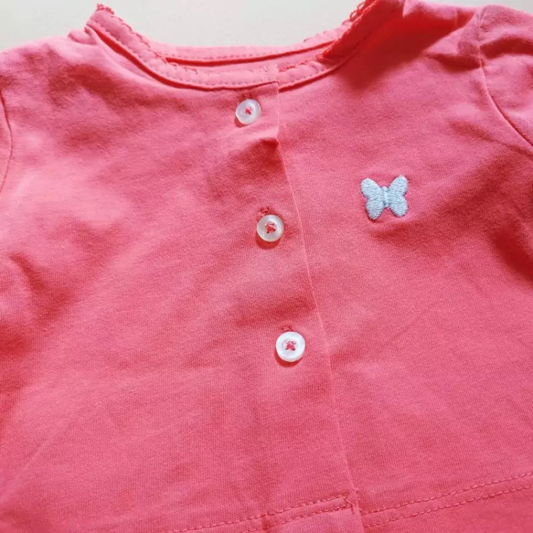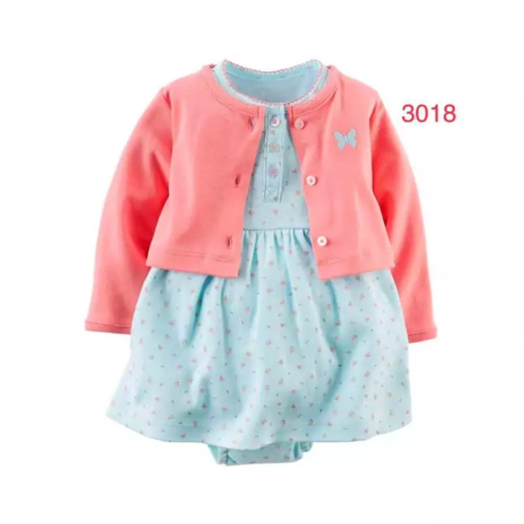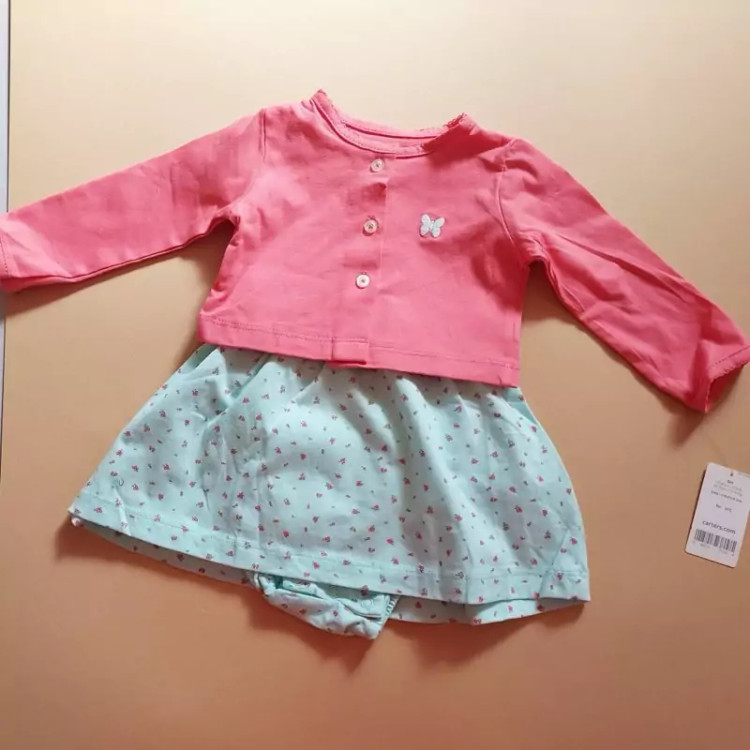 سارافن خوشگلمون جنسش نخ پنبه ست و وارداتیه ... جلوی پیراهن گل گلی قشنگش سه تا دکمه میخوره که موقع پوشوندن از سر کوچولوتون اصلاااا اذیت نمیشه . زیر پیراهن هم شورت داره که سه تا دکمه فشاری زیر پمپرز میخوره اینجوری برای تعویض پوشک هم کارتون راحته . کت لباس هم کاملا نخی و راحته . این ست هم یه کار خونگی شیکه هم میتونه برای بیرون و مهمونی استفاده بشه . جلوی کت هم طرح پروانه گلدوزی شده و باز سه تا دکمه میخوره . محصول فوق العاده جذابمون از برند کارترز و اورجیناله پس خیالتون بابت جنس راحت راحت باشه . از سایز ۳ ماه تا دو سال هم قابل سفارشه .