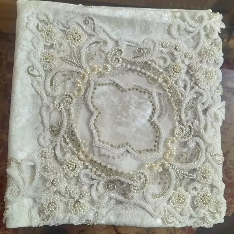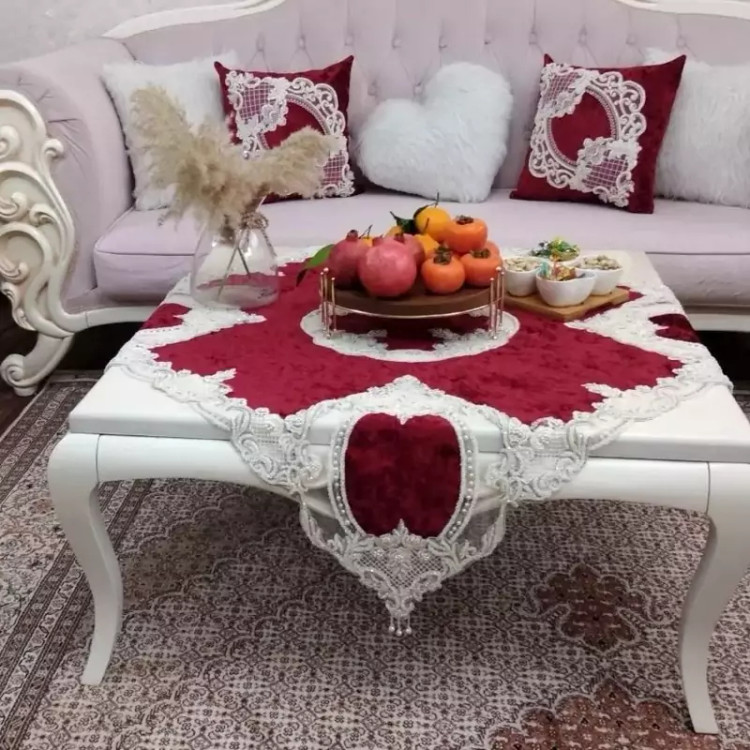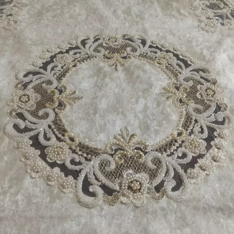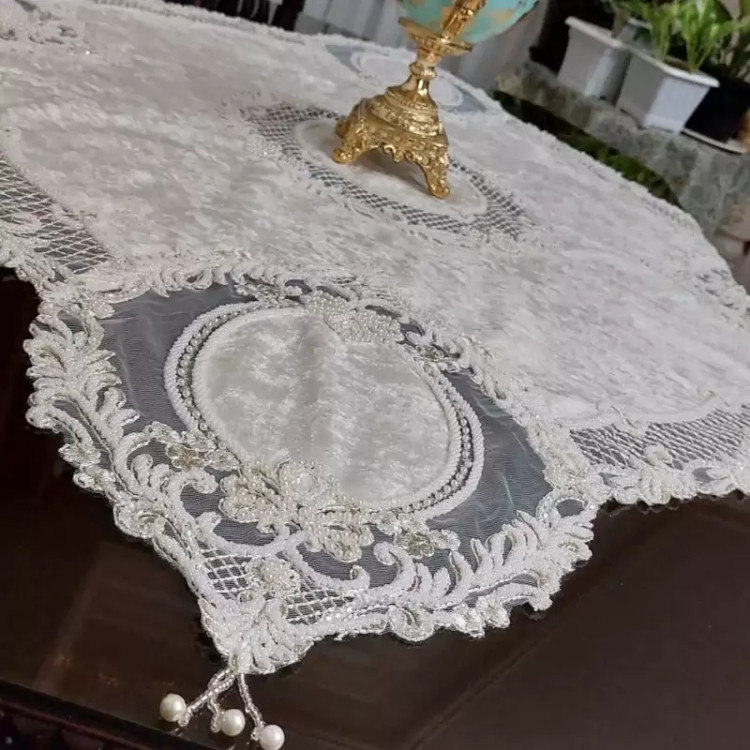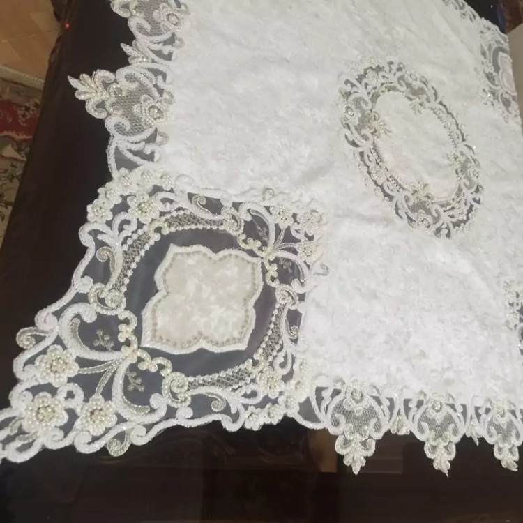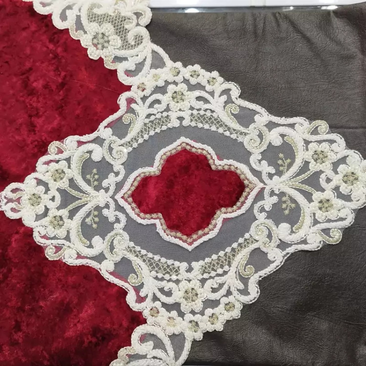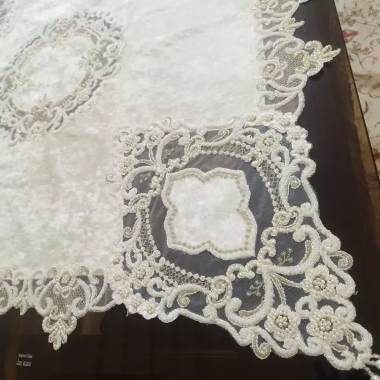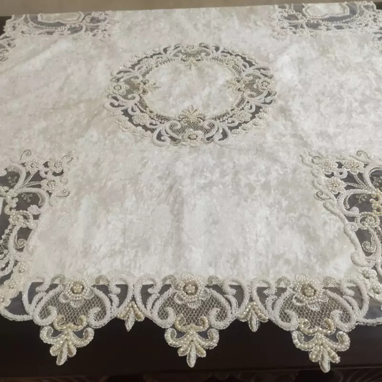 رومیزی مروارید و کریستال دوزی شده روی مخمل دانتل مربع مناسب میز خاطره، جلومبلی و اپن