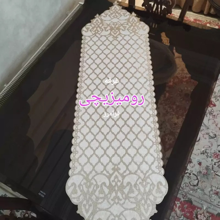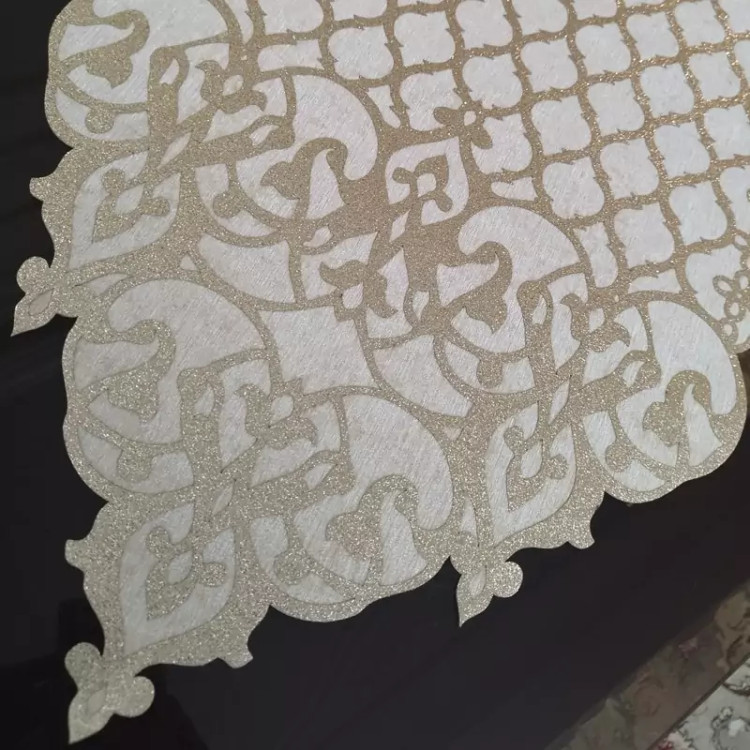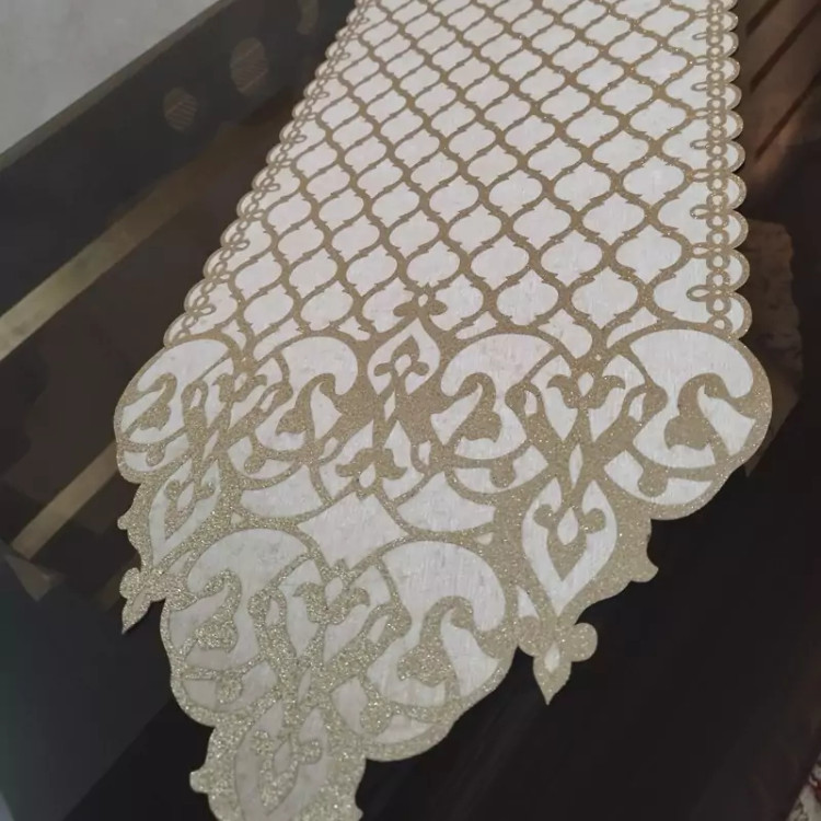رومیزی رانر ناهارخوری و اپن چرم اکلیلی طلایی با مخمل طول 135 سانت
