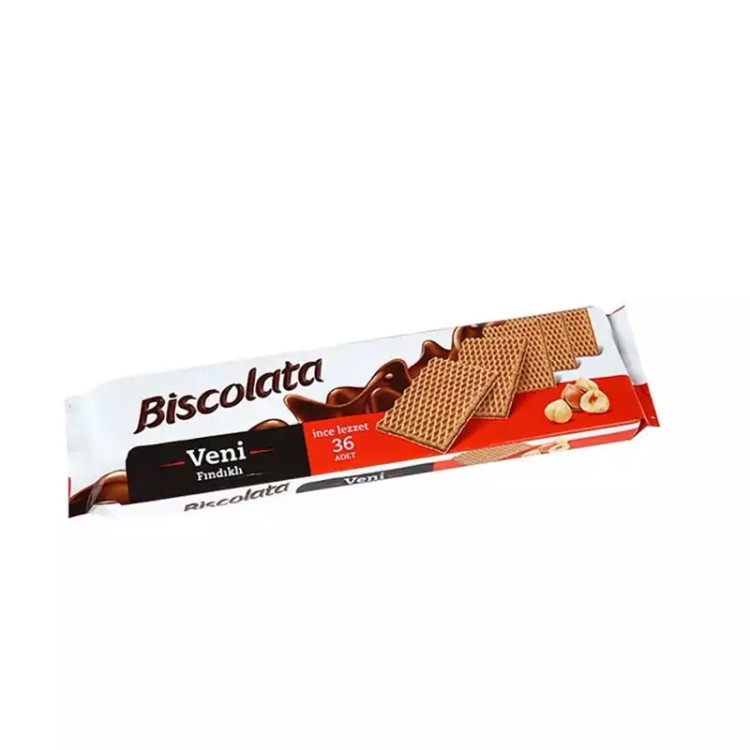 ویفر کرم شکلاتی فندقی بیسکولاتا Biscolata یکی از بهترین برند ترکیه است. ویفر ها از نظر شکل و تولید، فرآورده هایی کاملا متفاوت از دیگر انواع بیسکویت هستند.خمیر همه این ویفر ها یک نوع می باشد و ممکن است این ویفر ها به صورت صفحات بسیار نازک، صفحات ضخیم، قیفی، صفحه ای و تیوبی تهیه شود. این محصول یکی از بهترین و لذیذ ترین محصولات در ترکیه هستند. ویفر فندقی با طعم کرم فندق، ساخت کشور ترکیه می باشد.