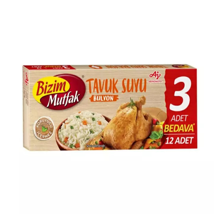 عصاره مرغ بیزیم موتفاک Bizim Mutfak محصولی از کشور ترکیه شامل 12 عدد قرص مکعبی 10 گرمی برای طعم دهی به غذاهای شما طراحی شده است.