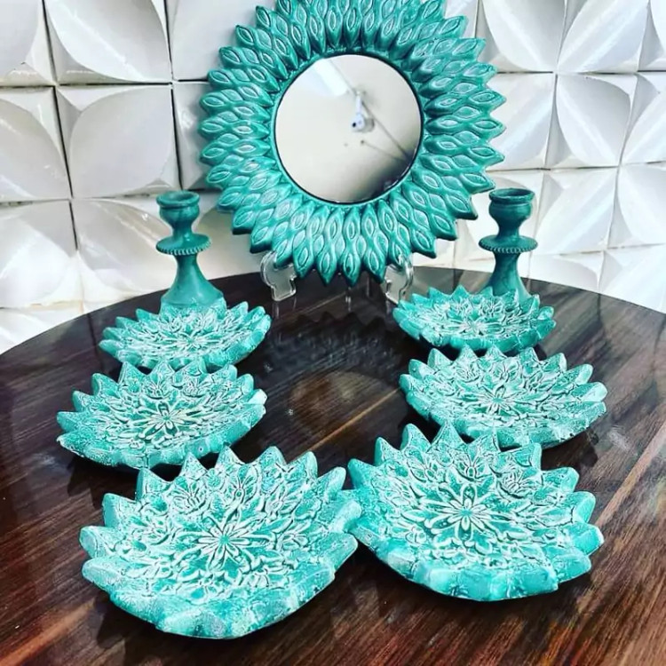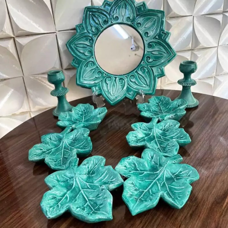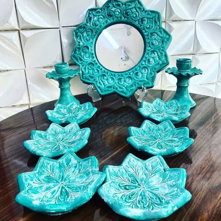 هفتسین سفالی آبی رنگ به همراه آینه و شمعدان هفت سین فیروزه ای سفالی