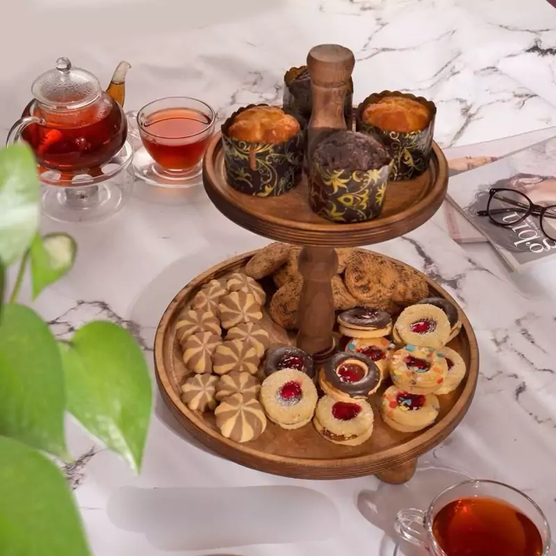 شیرینی خوری دو طبقه چوبی گرد پایه دار شیرینی خوری دوطبقه چوبی پایه دار استند دوطبقه چوبی