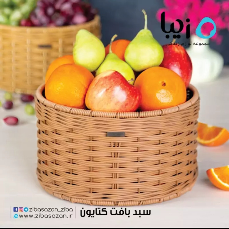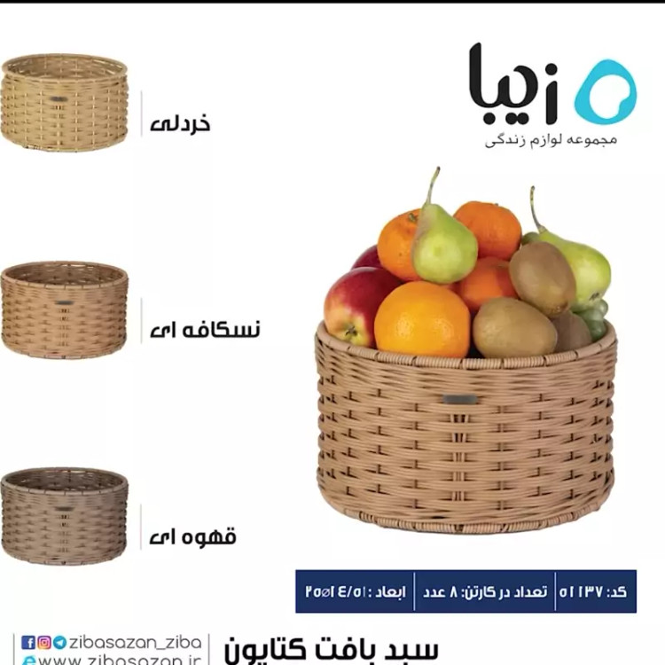 سبد بافت کتایون زیباسازان مناسب برای سرو میوه و سبزیجات روی میز پذیرایی ، نظم دادن به میز آرایشی و … است . جنس این محصول از پلاستیک میباشد . از مزایای این محصول میتوان به استقامت ،ضد آب بودن ،پوسته پوسته نشدن طی استفاده مداوم و زیبایی آن اشاره کرد .در رنگبندی های قهوای.نسکافه ای.خردلی