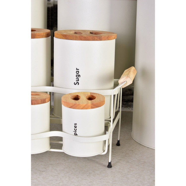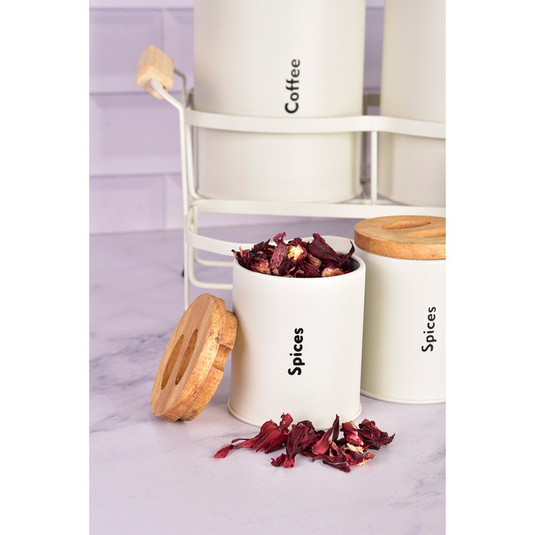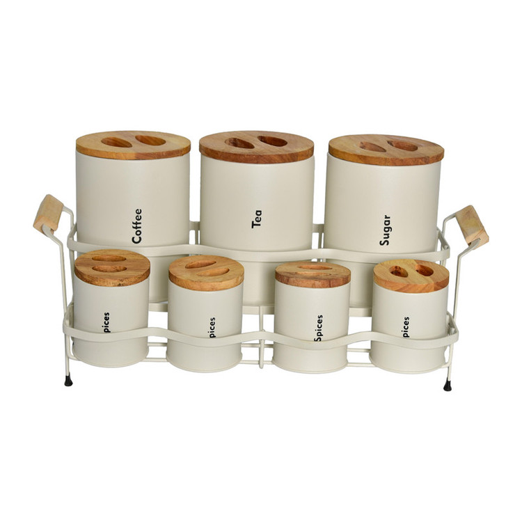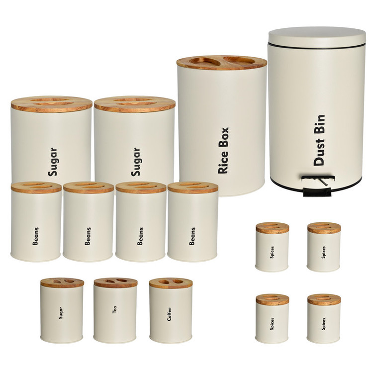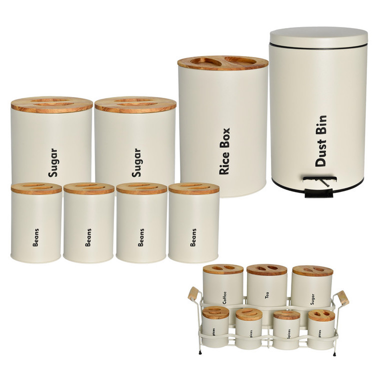 3 عدد پاسماوری، 4 عدد جای ادویه، 4 عدد ظرف حبوبات، 1 عدد سطل زباله، 1 عدد سطل برنج، 1 عدد جای قند، 1 عدد جای شکر.1 عدد استند