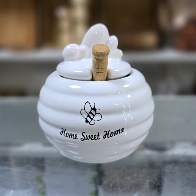 جا عسلی سرامیکی درب دار به همراه قاشق چوبی ارتفاع ان 11 سانت و قطر ان 9 سانت می باشد